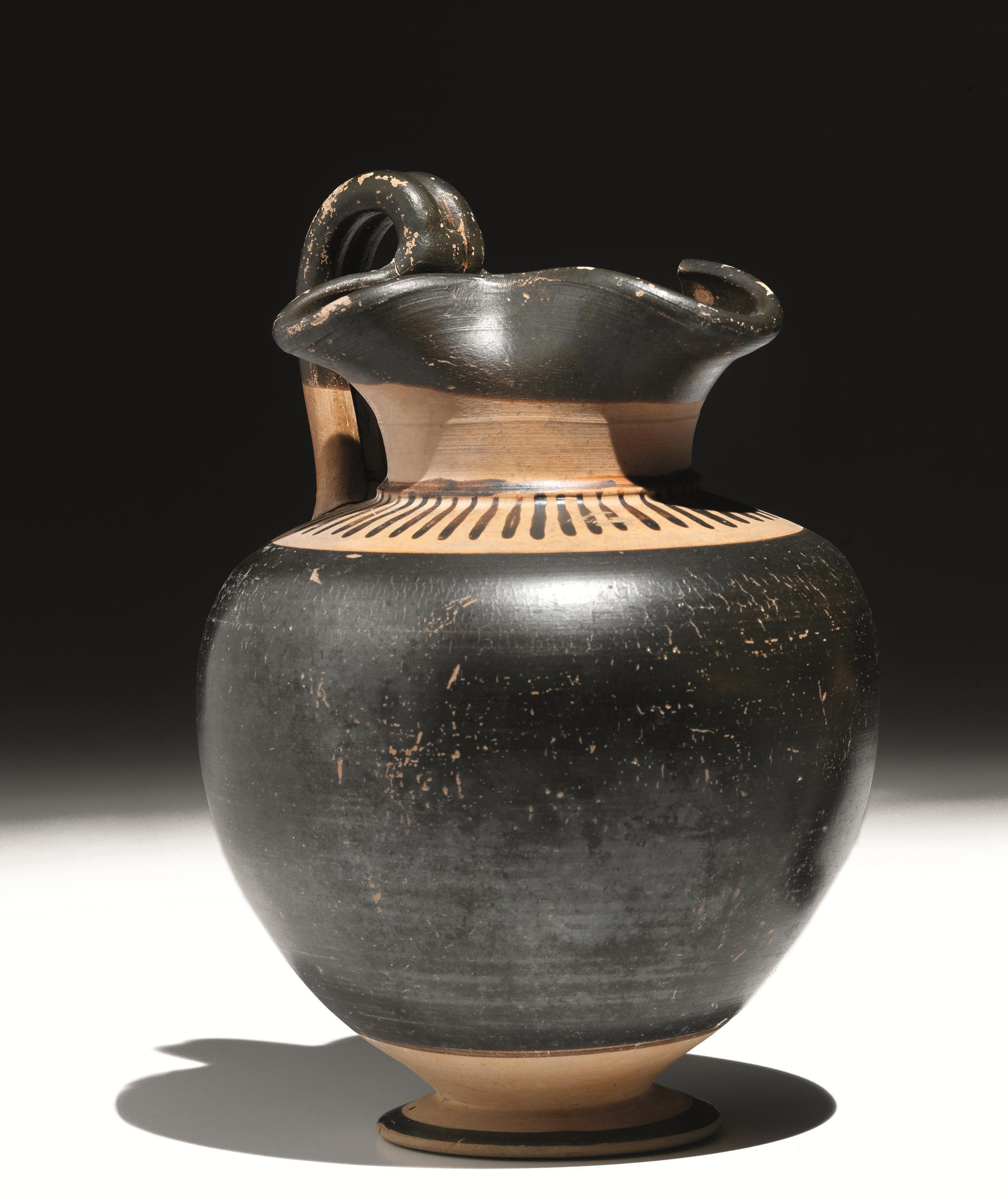 Decorazione: interno della bocca risparmiato, esterno e ansa verniciati; sulla spalla, risparmiata, linguette radiali, ventre interamente verniciato ad eccezione di una fascia all’attacco con il piede