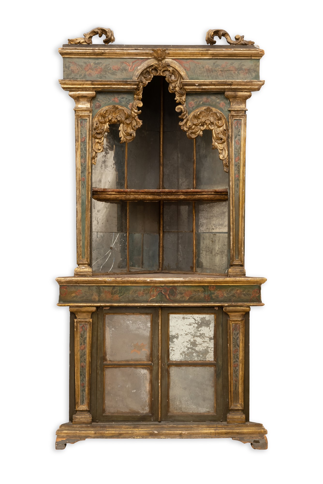 Vano a giorno racchiuso tra due lesene dorate e dipinte in policromia con mensola interamente ricoperto da specchi al mercurio ed incorniciato sul fronte da elemento decorativo riccamente dorato e intagliato a motivi vegetali.