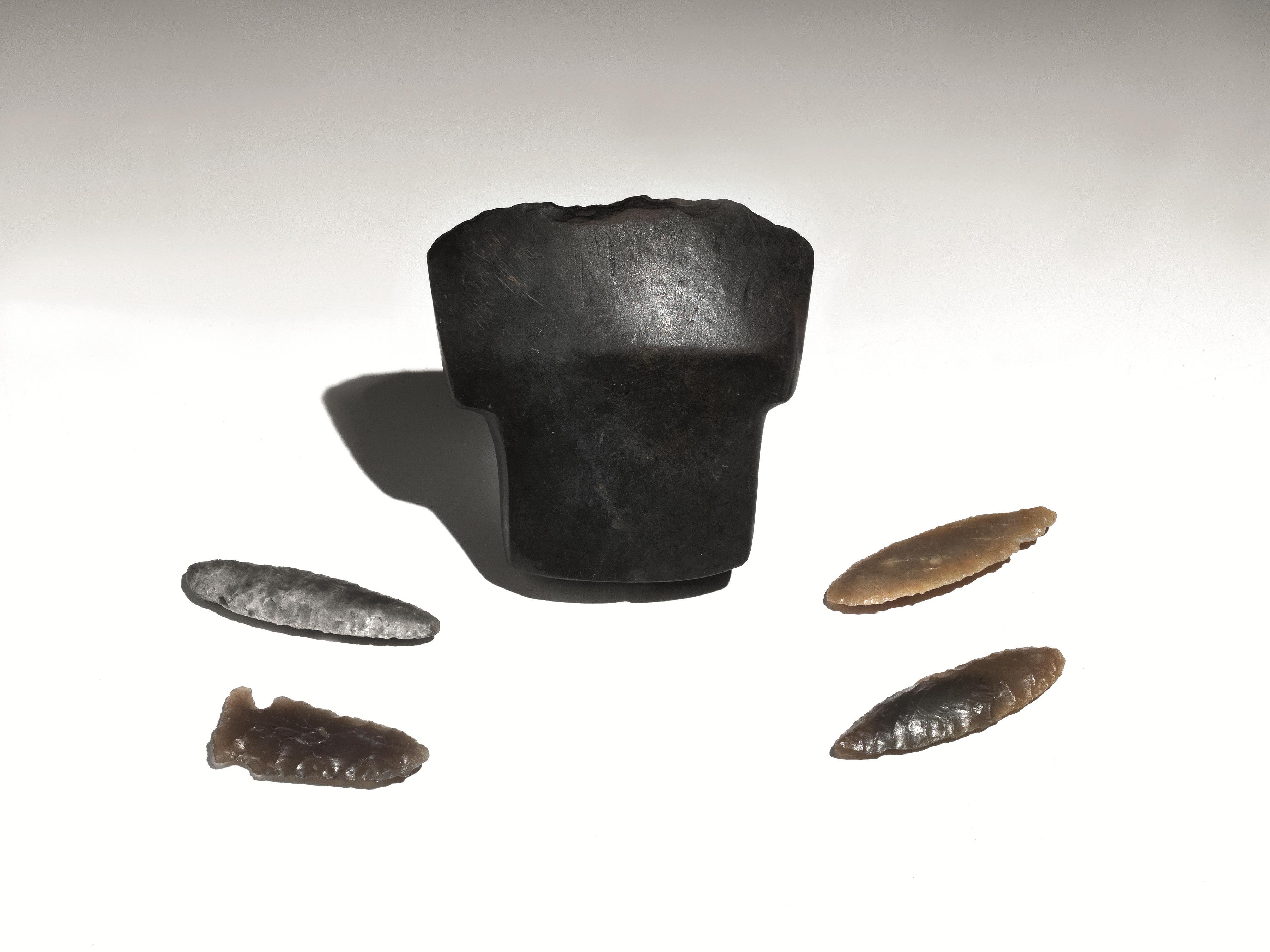 Quattro punte di freccia e un’ascia Materia e tecnica: selce e pietra...