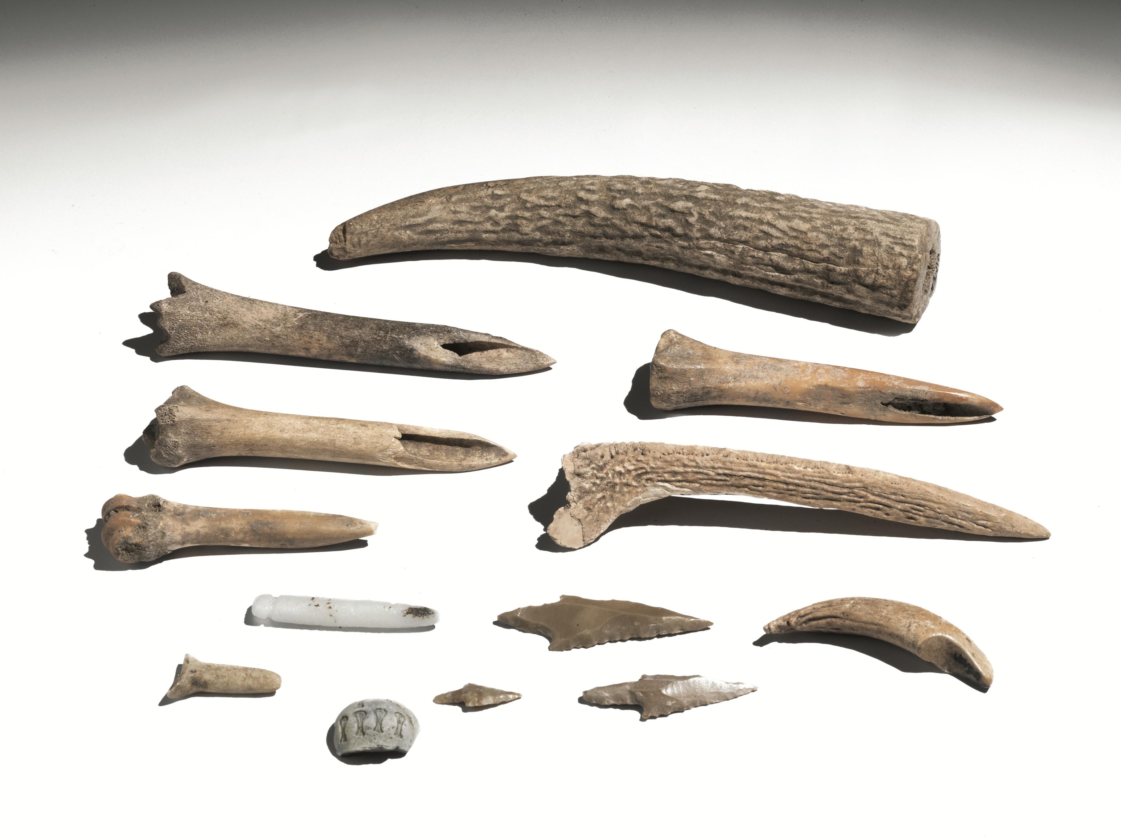 Cinque grandi aghi in osso; tre punte di freccia cuspidate di forma triangolare con piccolo codolo, due strumenti in pietra, un dente di cinghiale, un’immanicatura in corno di cervo ed un elemento in terracotta decorato a impressione (13)