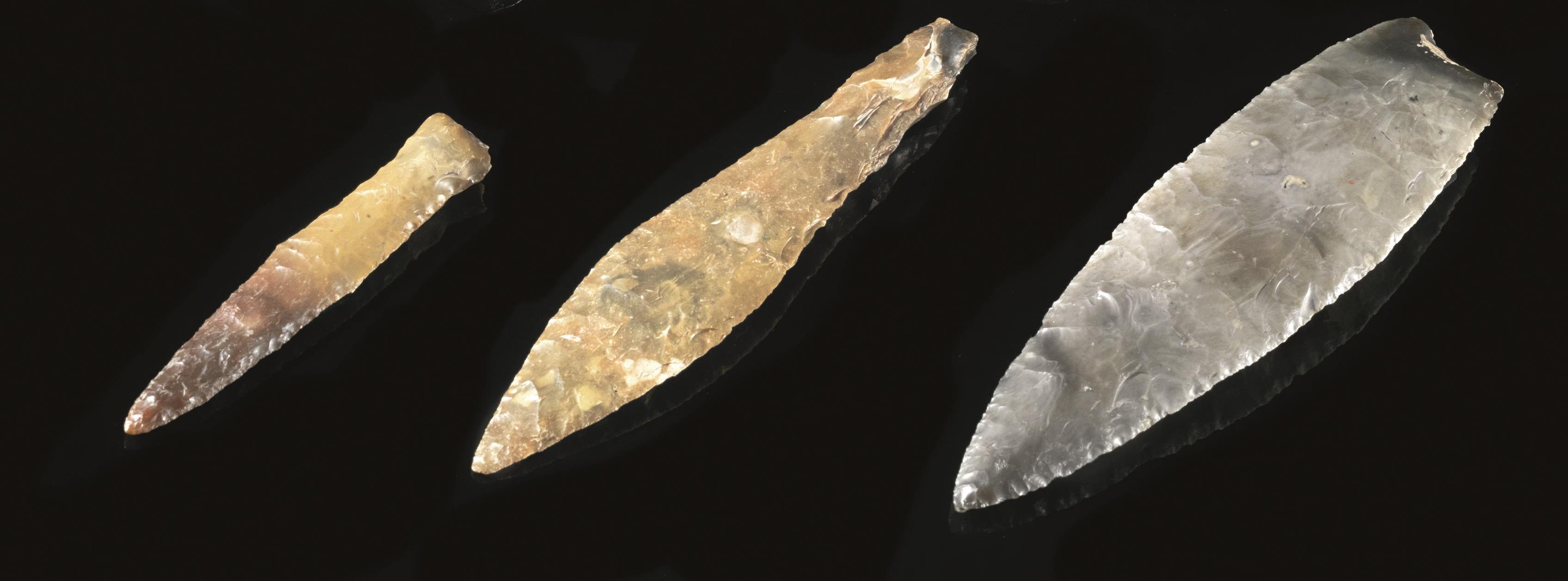 Tre grandi pugnali con lama foliata fortemente allungata, un’esemplare in selce bionda conserva l’impugnatura, mentre negli altri è spezzata;