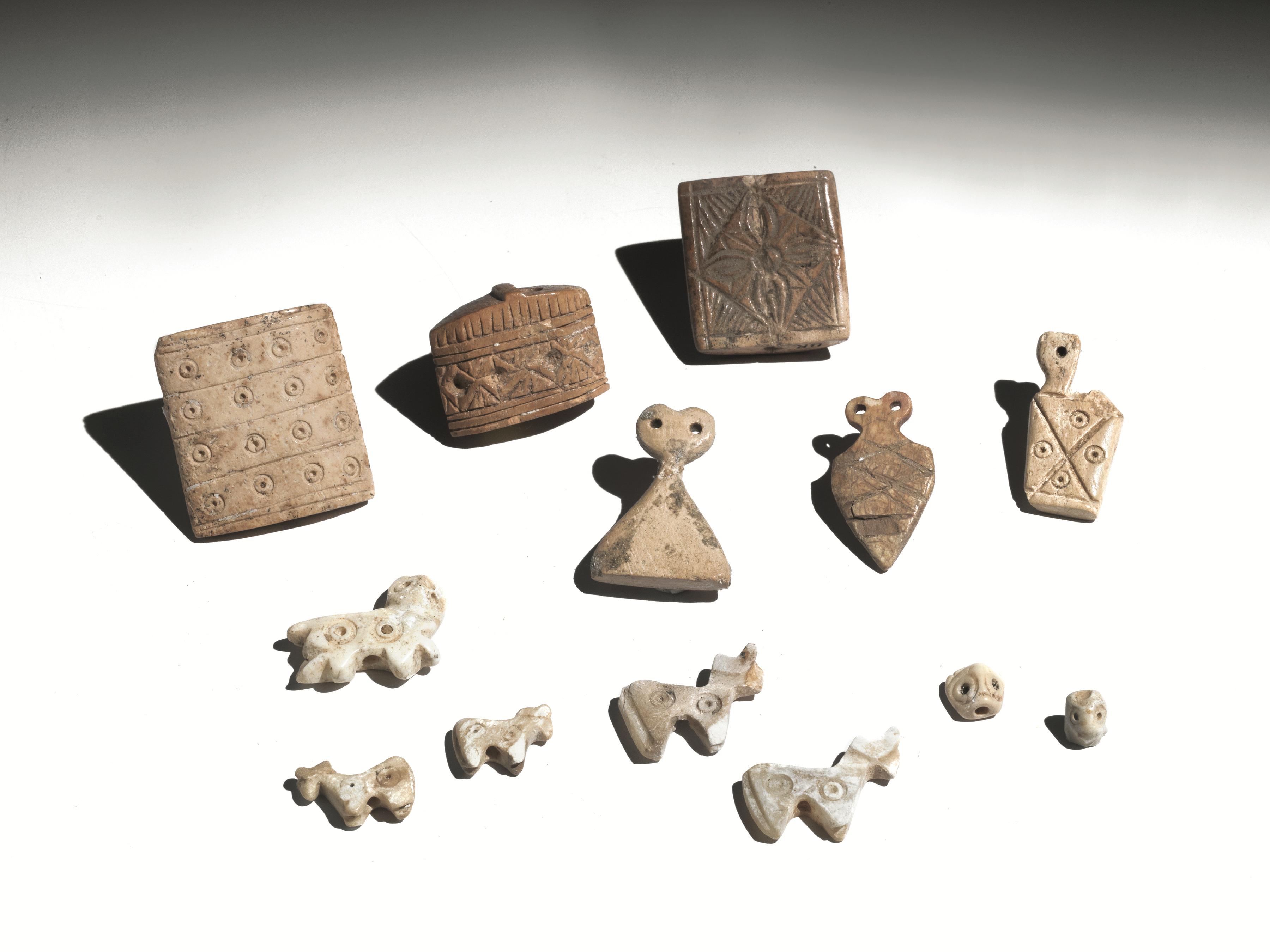 Tre piccoli idoli a occhi, uno originariamente con due teste decorati con linee incise; due piccole teste umane stilizzate a profilo triangolare; cinque quadrupedi gradienti di varie dimensioni decorati a cerchielli incisi, con foro passante di sospensione e tre elementi vagamente rettangolari con foro passante di sospensione decorati a cerchielli e motivi geometrici (13)
