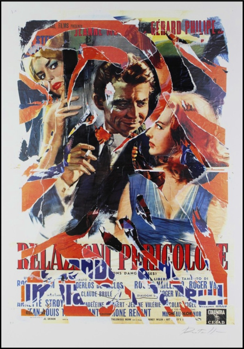 ROTELLA MIMMO Catanzaro 1918 - Milano 2006 "Relazioni pericolose" Multiplo décollage e strappi di manifesto su supporto serigrafico su cartoncino cm 70x100, del 2000-2009. Firmato sul fronte in basso a destra, tiratura P.A. Opera pubblicata sul catalogo "Mimmo Rotella Multiples décollage".