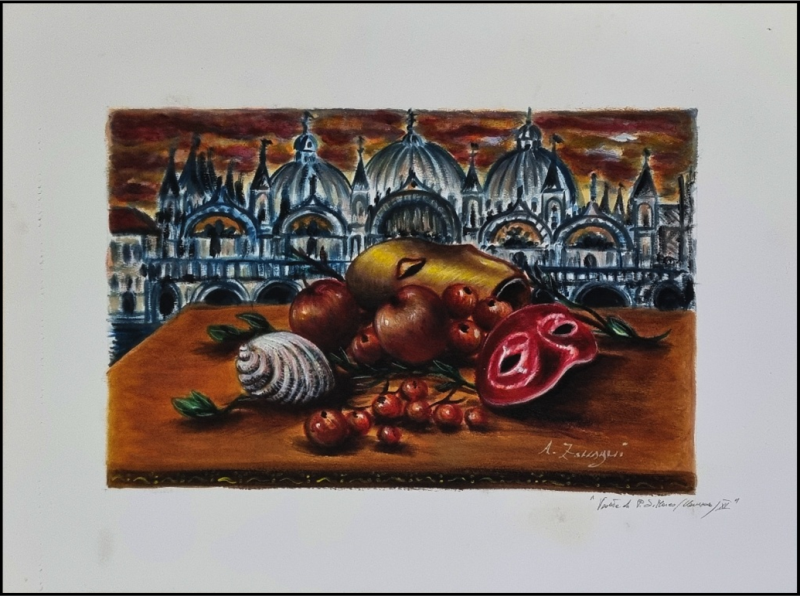 ZACCAGNI ADRIANA Italia 1961 "Veduta di piazza San Marco Venezia" Tecnica mista su carta cm 75x55. Firmato ed intitolato sul fronte in basso a destra.
