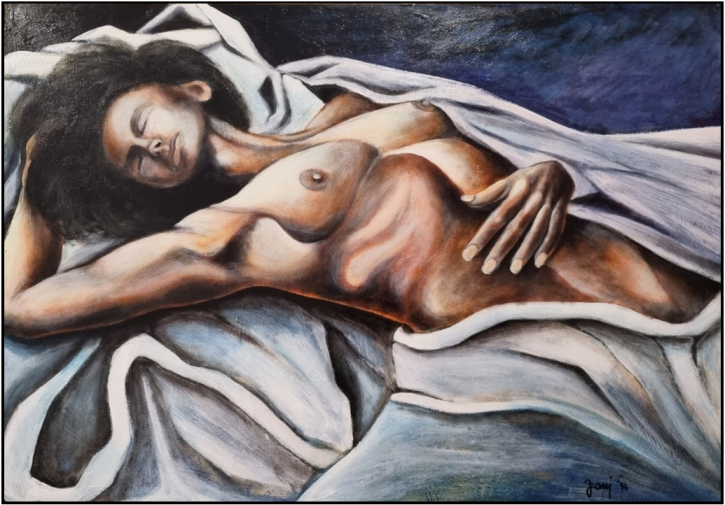 ZANI CORRADO Porcia 1952 "Il riposo" Olio su tavola cm 100x70 del 1994. Firmato e datato sul fronte in basso a destra. Sul retro firma, titolo, data e timbro della Galleria Il Castello.