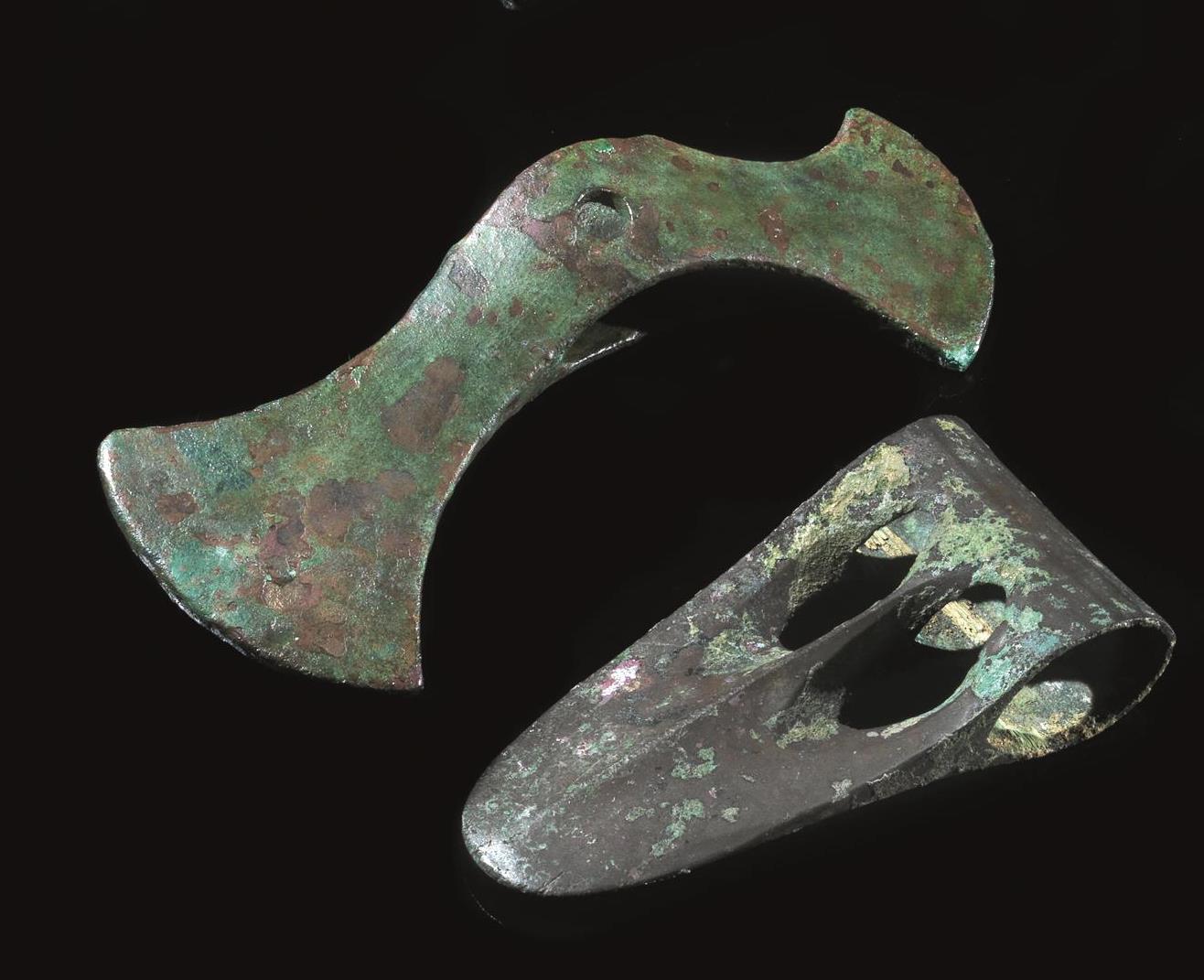 Due asce in bronzoMateria e tecnica: bronzo fuso e cesellatoAscia a becco...