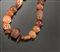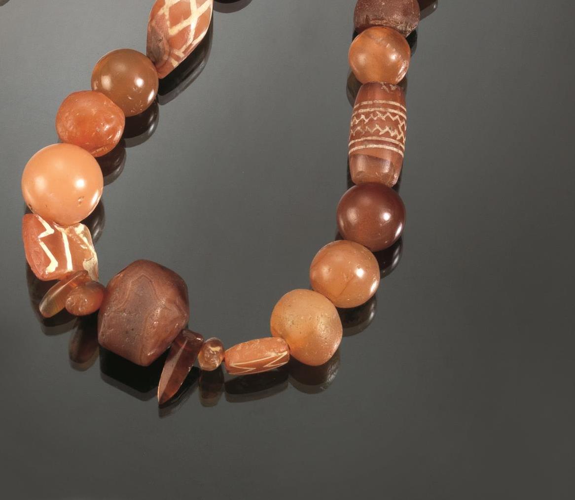 Lunga collana formata da vaghi di corniola sferici oblunghi e sfaccettati alcuni decorati da incisioni in bianco con motivi geometrici