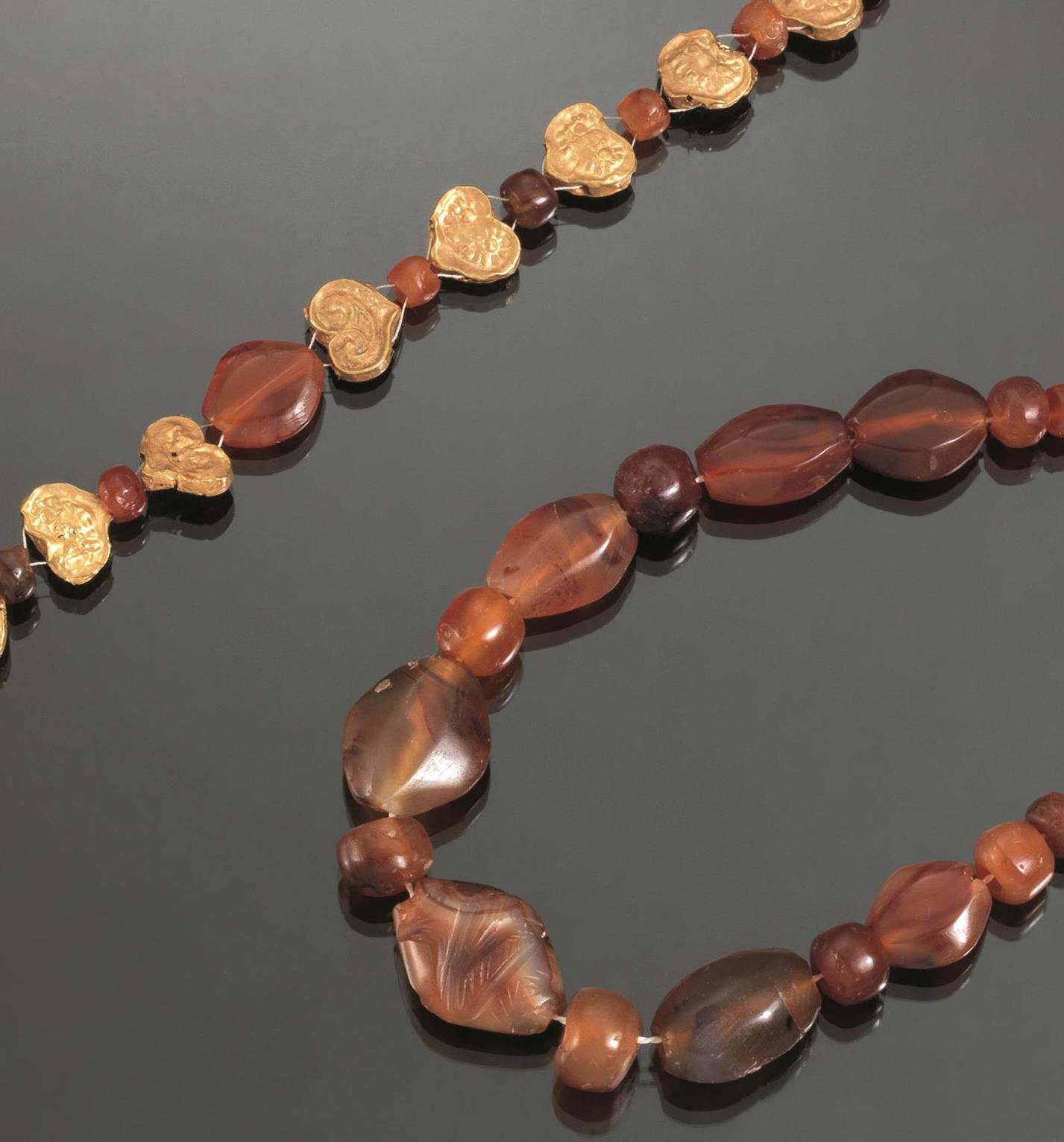 Frammento di collana in oro con diciotto elementi cuoriformi in oro sbalzati a rosette e intervallati da vaghi in corniola e frammento di collana in corniola con vaghi trapezoidali e cilindrici (2)