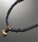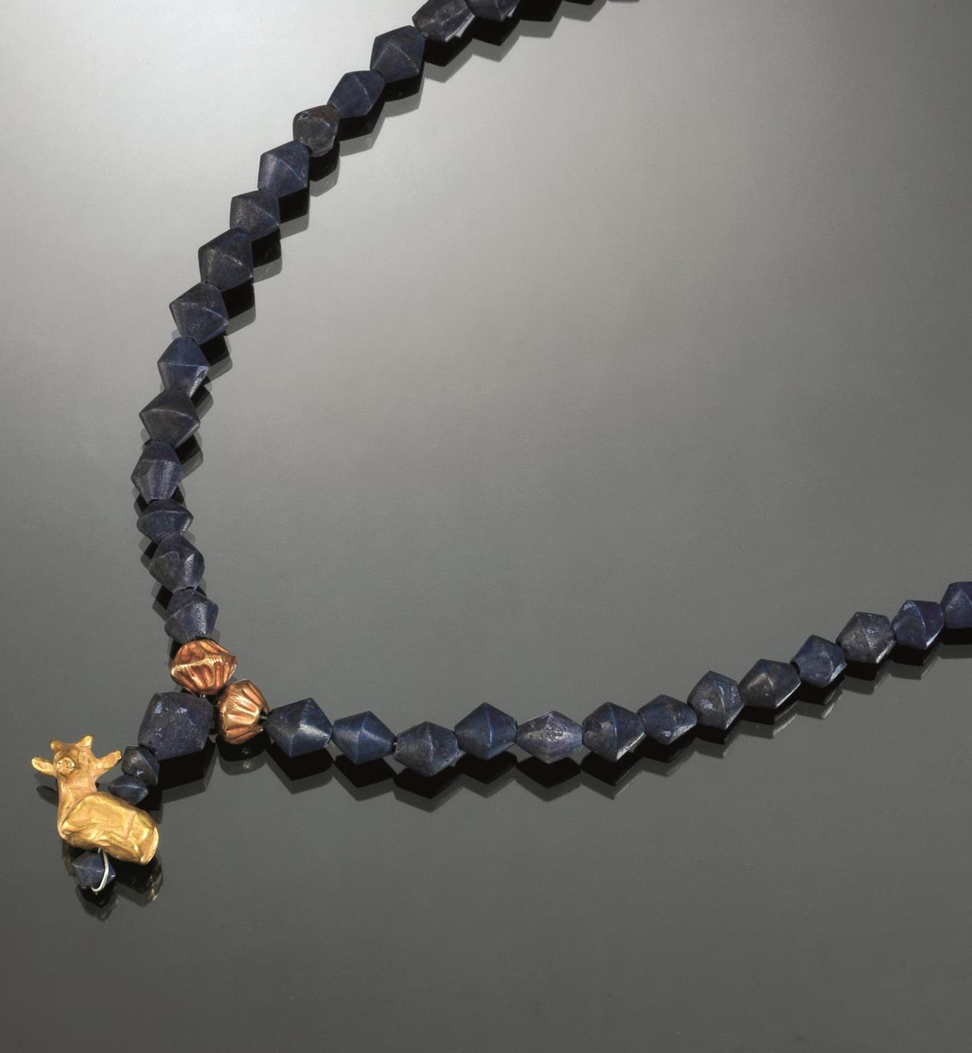 Collana formata da vaghi biconici in lapislazzulo, nella parte centrale due vaghi analoghi in lamina d’oro ed un pendente modellato come un vitello accucciato
