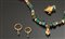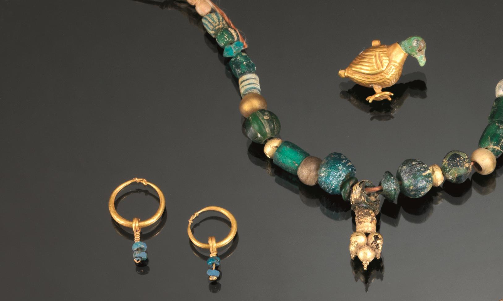 Parte di collana con vaghi in pasta vitrea verde, azzurra e oro con pendente in lamina d’oro formato da un grappolo di sferette; coppia di orecchini da bambina in filo d’oro con pendente a due cerchielli in pasta vitrea turchese ed un pendente in forma di aquilotto in lamina d’oro con testa in faience (4)