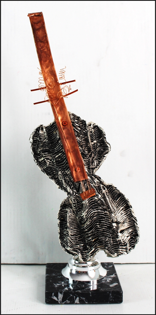 M'HORO' Italia XX sec. "Violino" Scultura in resina e manico in rame, cm 45x16x6. Esemplare 9/99. Autentica dell'artista su foto.