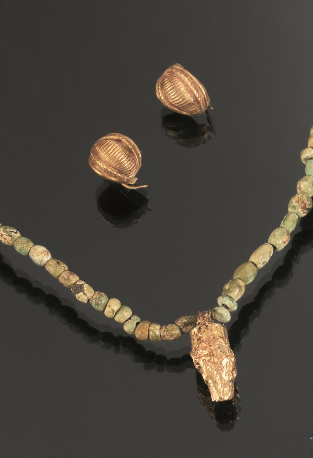 Una collana con in vaghi di varie forme in turchese e pendente centrale in lamina d’oro in forma di testa di pantera e coppia di orecchini in lamina d’oro sbalzati con motivo a foglia (3)
