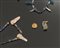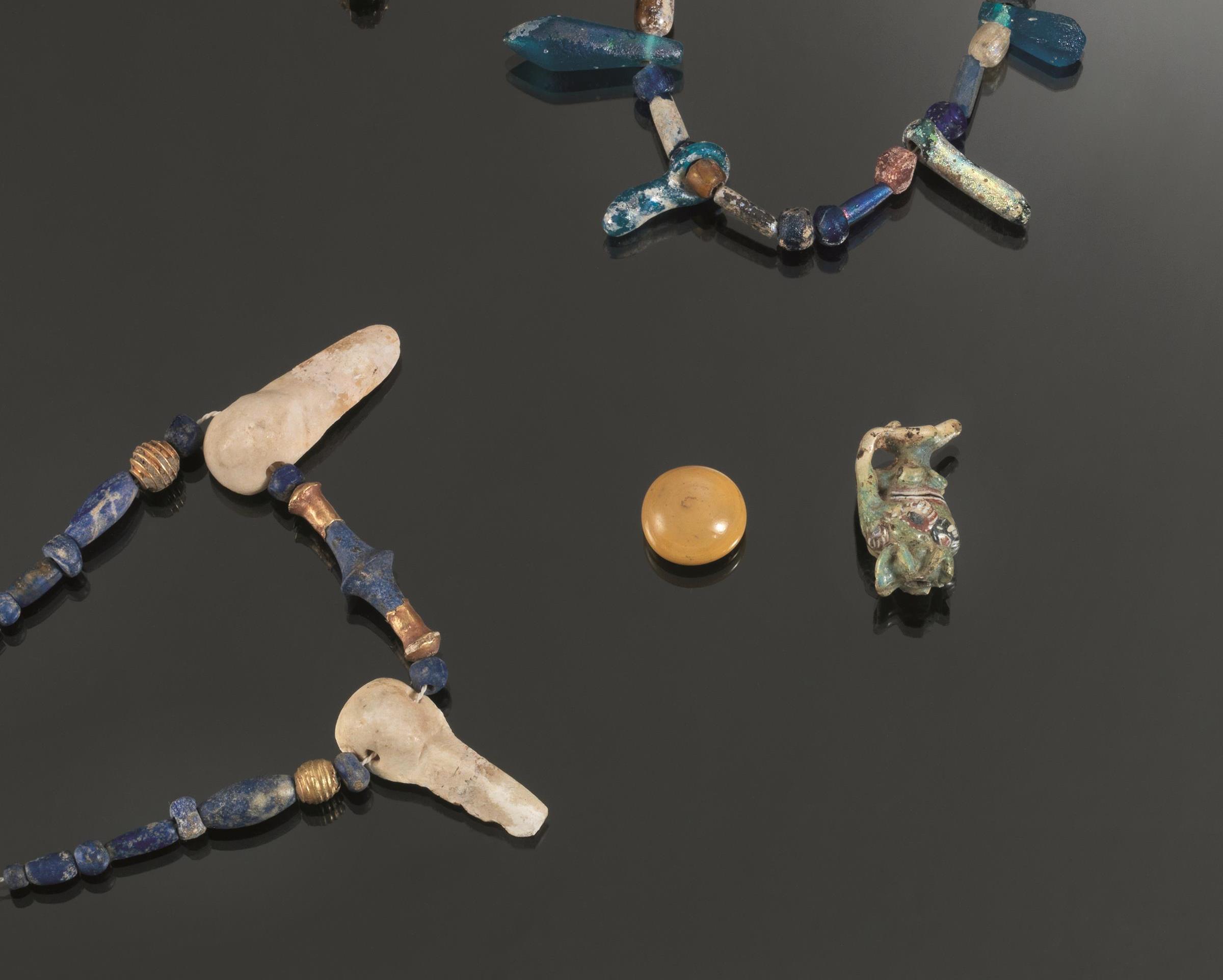 Parte di collana achemenide costituita da vaghi di varia forma in lapislazzulo, due pendenti in osso in forma di testa d’anatra stilizzata, due sferette in oro ed elemento centrale con estremità rivestite in lamina d’oro; una collana costituita da vaghi e pendenti in pasta vitrea blu, azzurra, verde e ambra; una oinochoe miniaturistica in pasta vitrea verde con decoro a murrina e un bottone in pasta vitrea gialla (4)