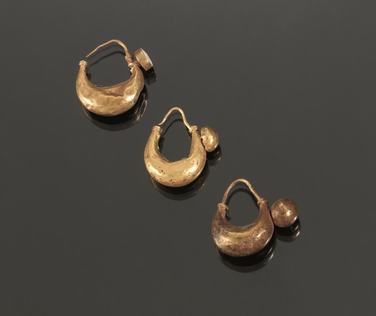 Tre orecchiniMateria e tecnica: lamina d’oro e pasta vitreaTre orecchini in...