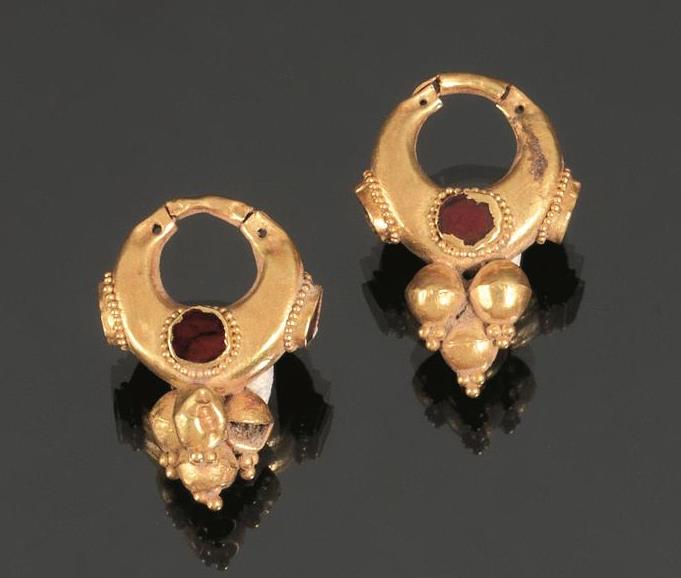 Coppia di orecchini in oro di forma lunata decorati da tre castoni con granati e pendente a grappolo di sferette (2)