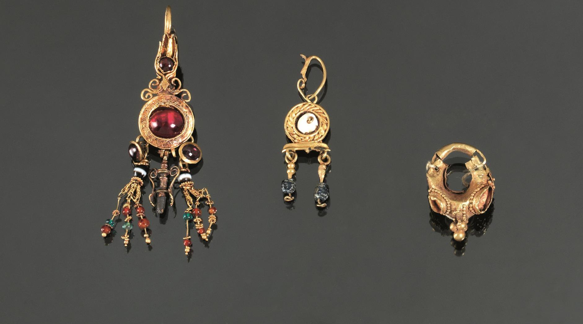 Un orecchino con pendente a scudo circolare centrato da granato con tre pendenti formati da piccoli fili d’oro a cui sono sospese paste vitree colorate; un orecchino simile ma di dimensioni minori centrato da una pasta vitrea bianca; ed uno a mezzaluna decorato a granulazione su ciascun lato con castoni ovali per l’inserimento di paste vitree (3)