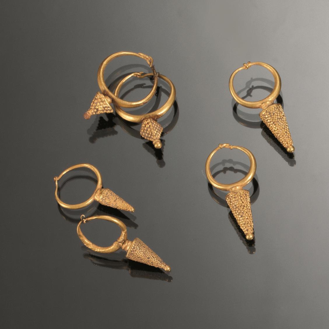 Tre coppie di orecchini con anello in filo d’oro e pendente a grappolo di sferette di forma conica o piramidale (6)