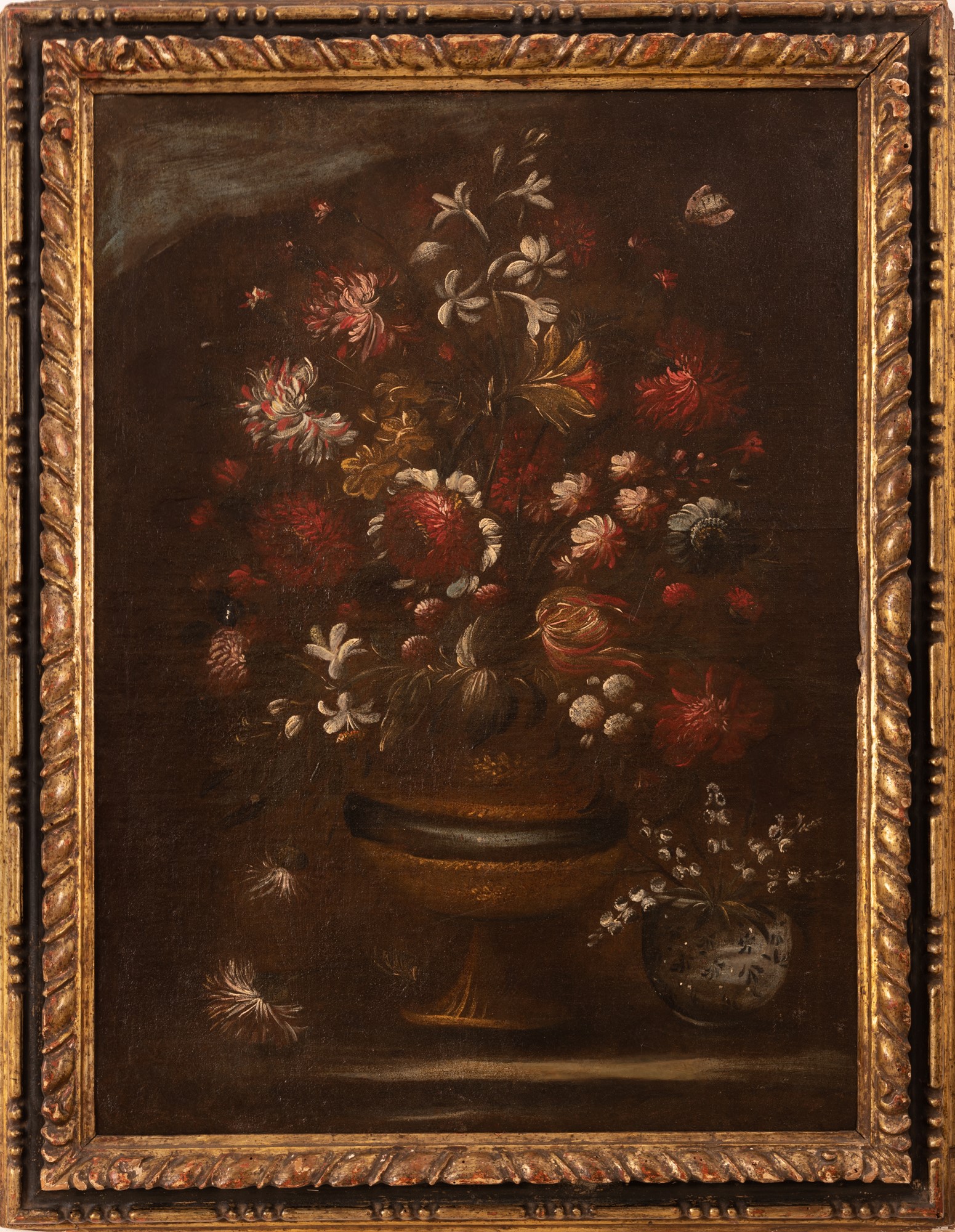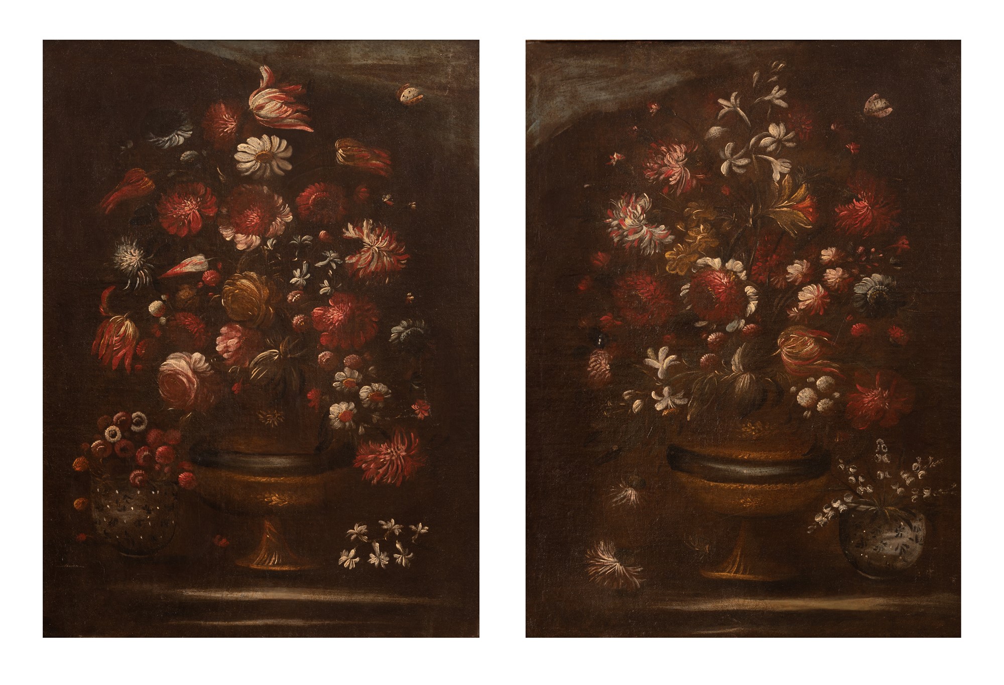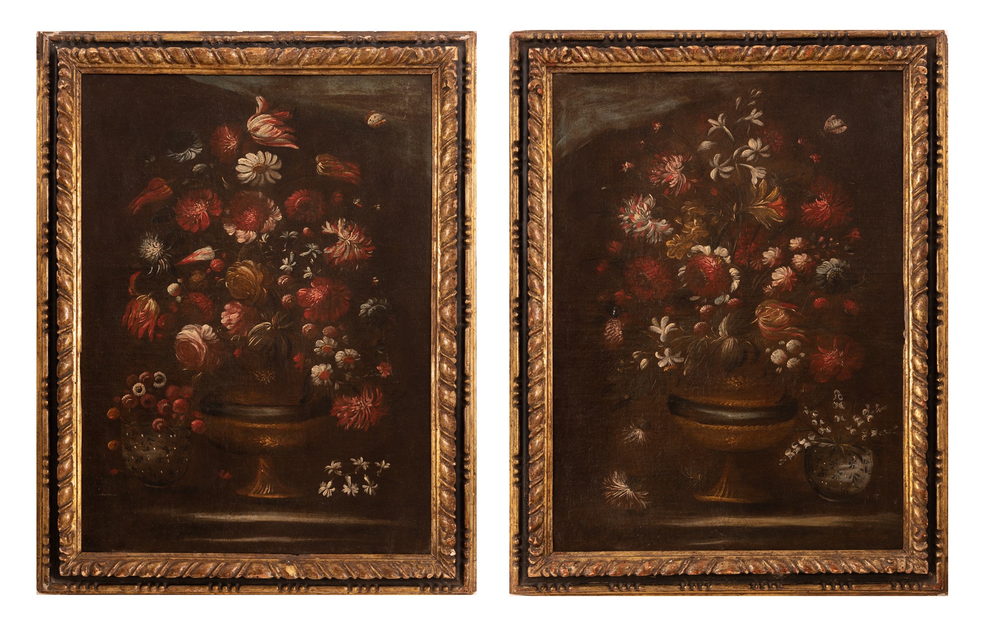 Pittore romano della fine del XVII e del XVIII secolo Coppia di nature morte raffiguranti vasi con fiori