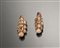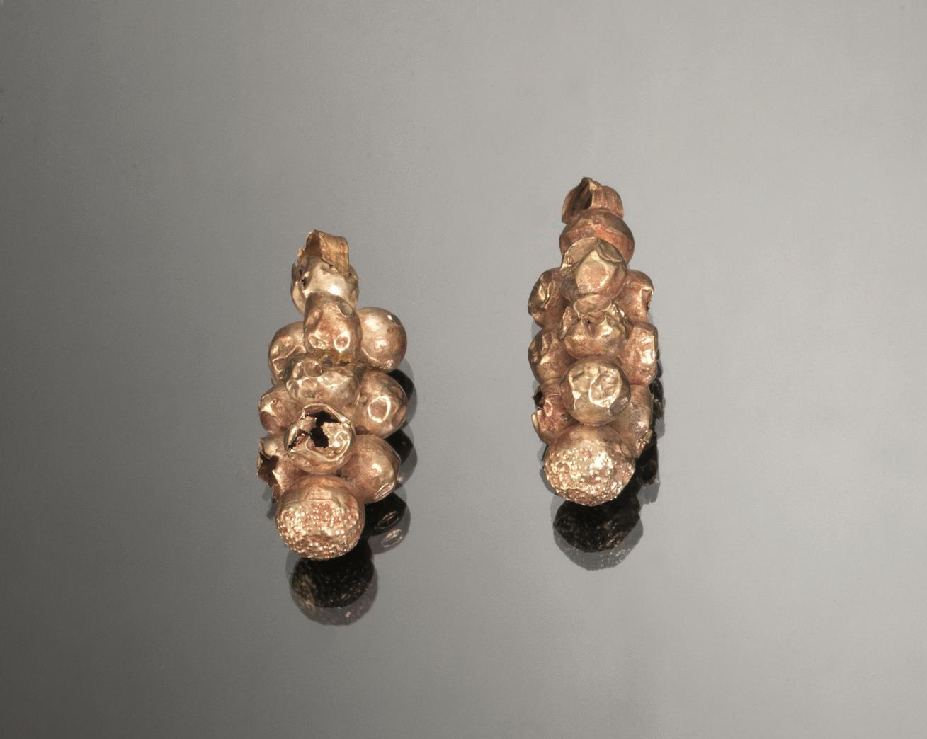 Coppia di pendenti modellati a tre gruppi di tre sferette sovrapposte con una sfera di dimensioni maggiori alle due estremità ; la sfera inferiore è fittamente decorata a puntini sbalzati (2)
