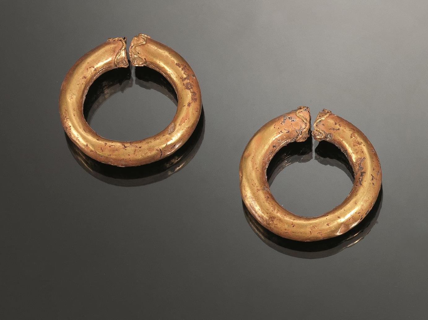 Coppia di grandi orecchini in lamina d’oro, cavi all’interno decorati alle estremità con un motivo serpentiforme in rilievo