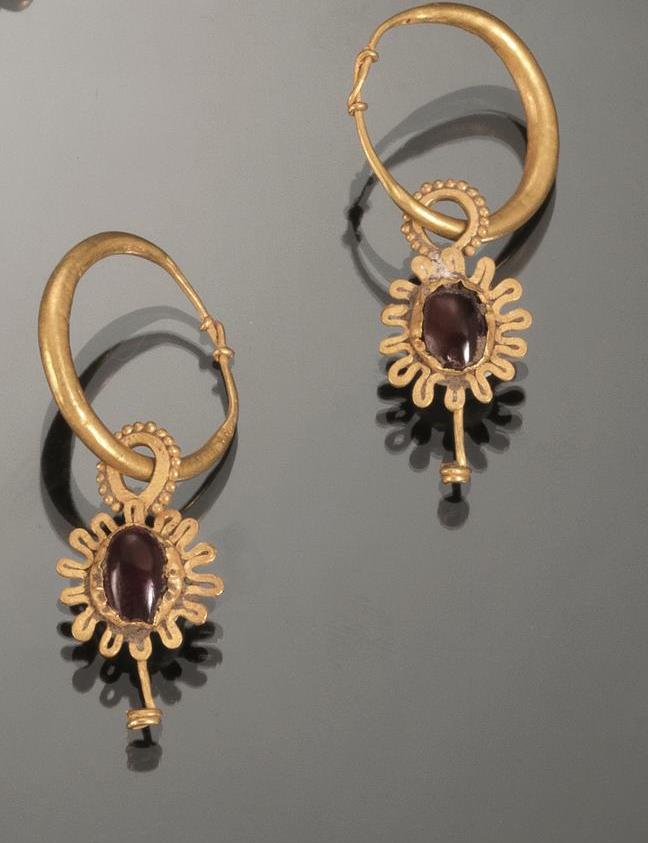 Coppia di orecchini Materia e tecnica: oro laminato e granati Coppia di...