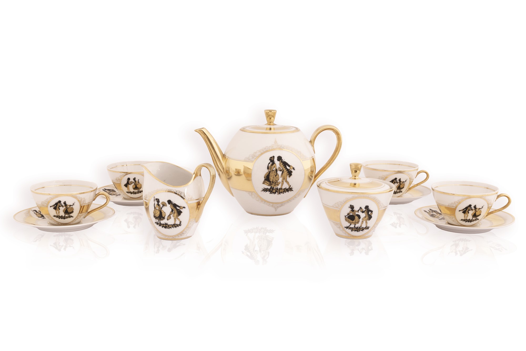 Composto da 12 tazze con piattino, 1 teiera, 1 zuccheriera e 1 lattiera,