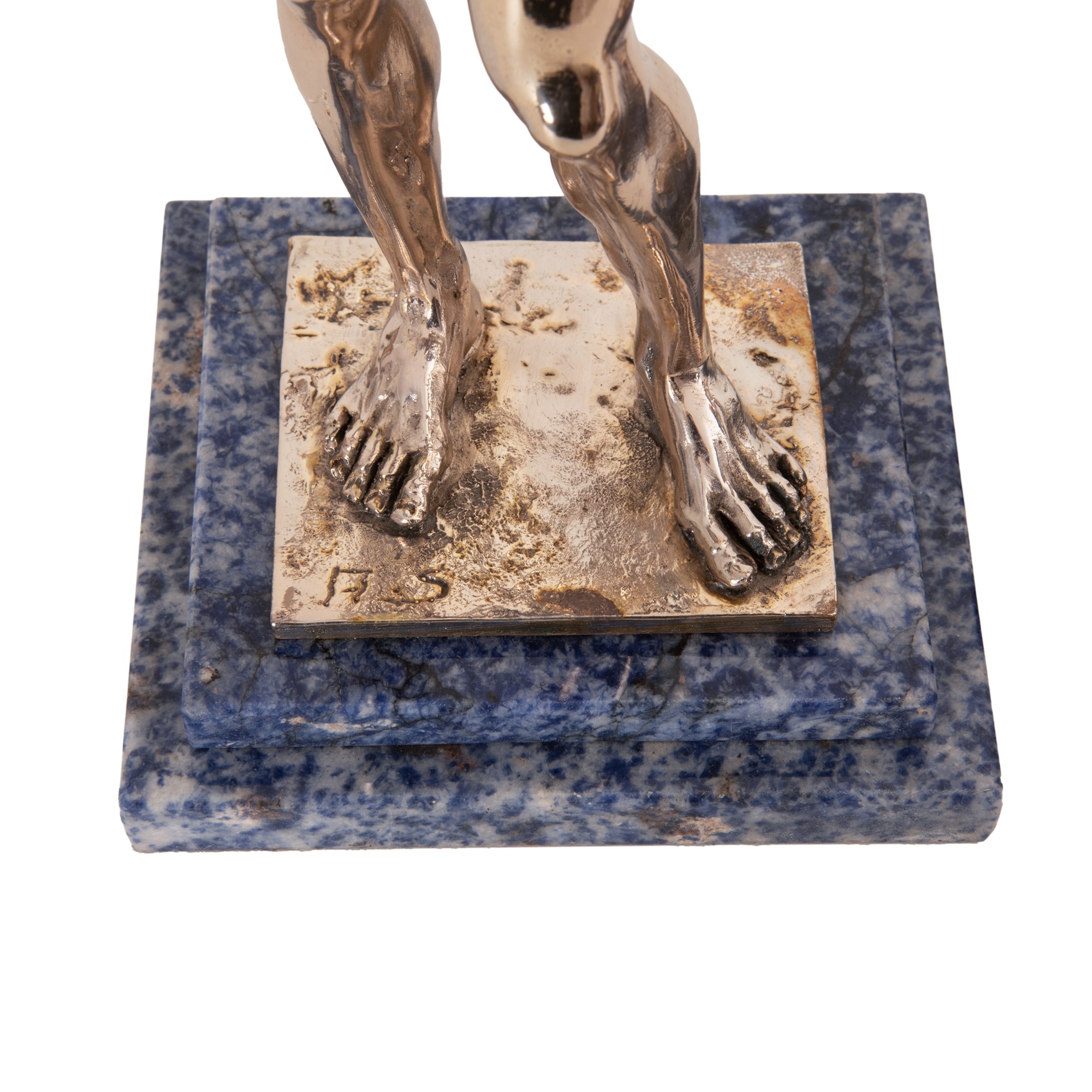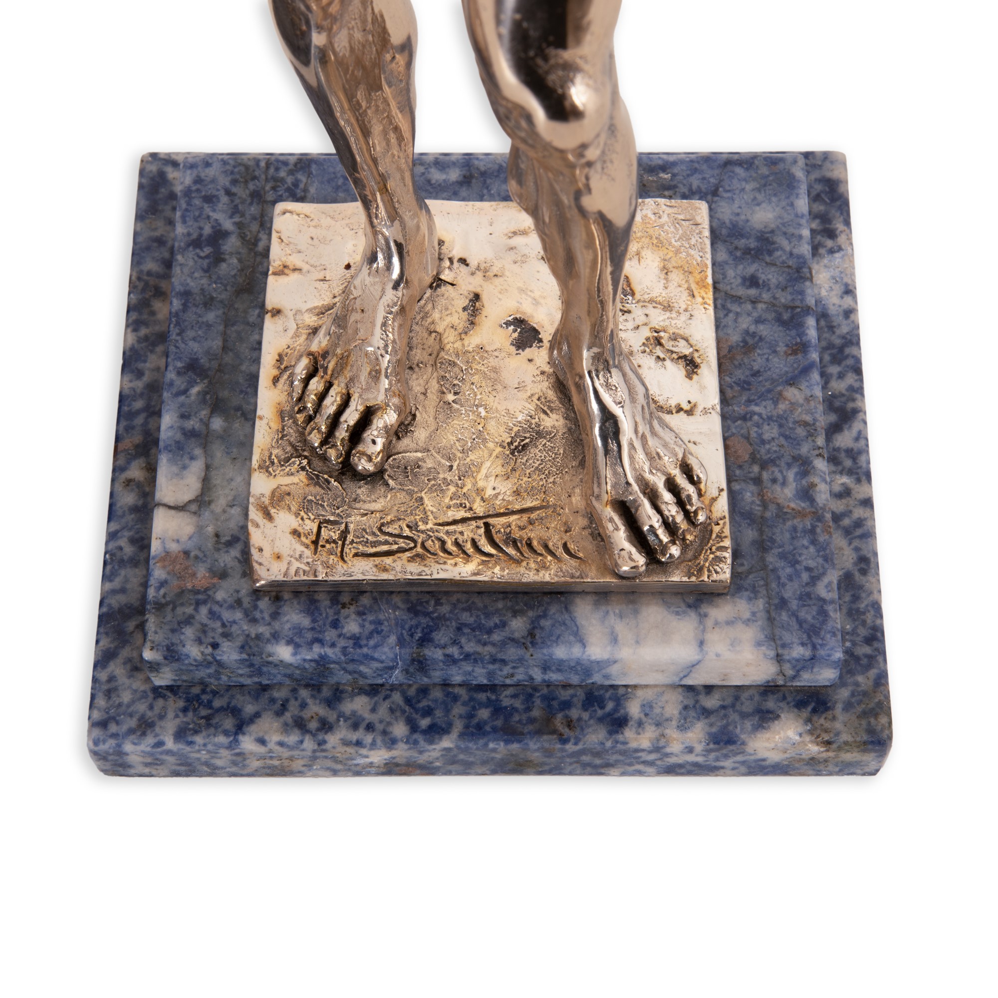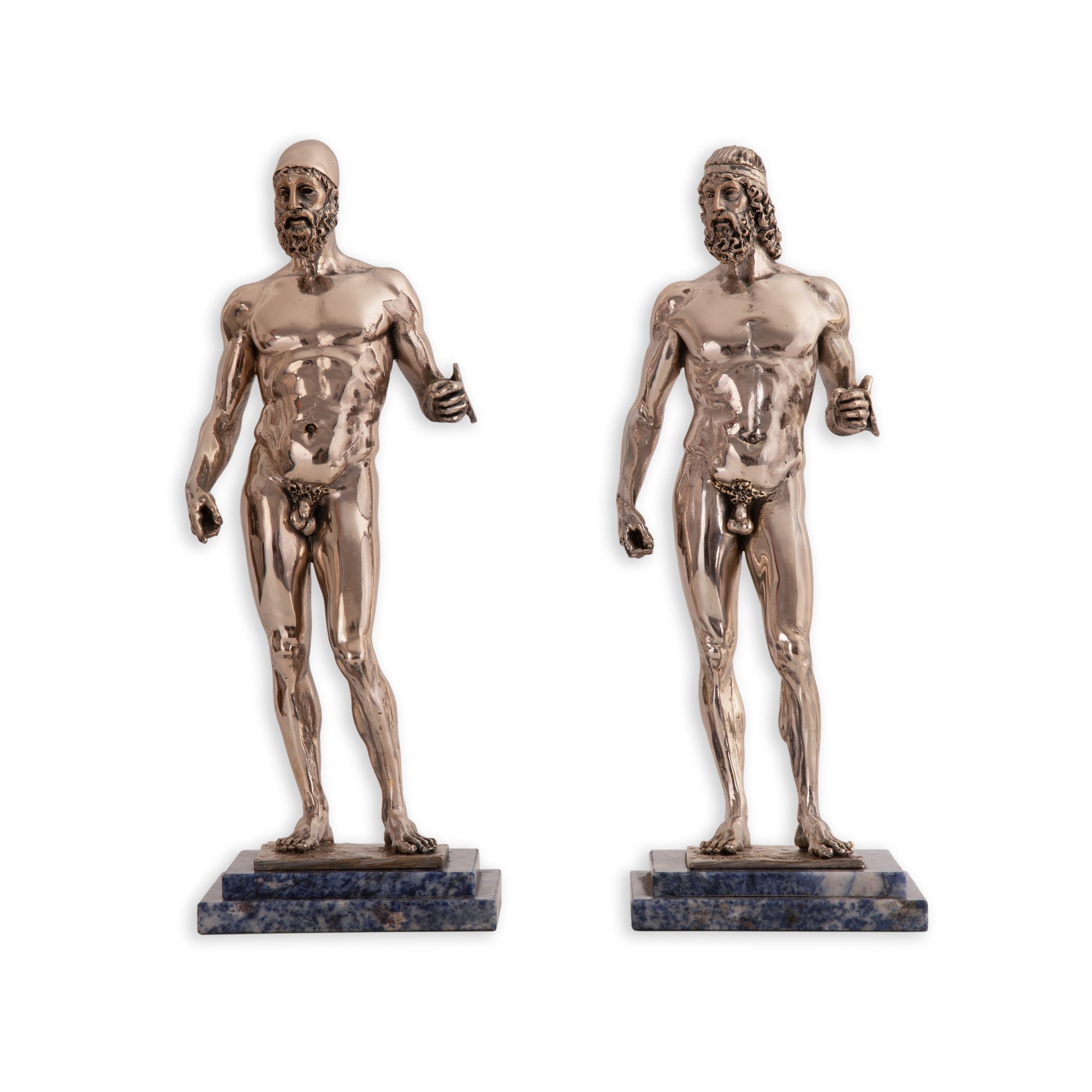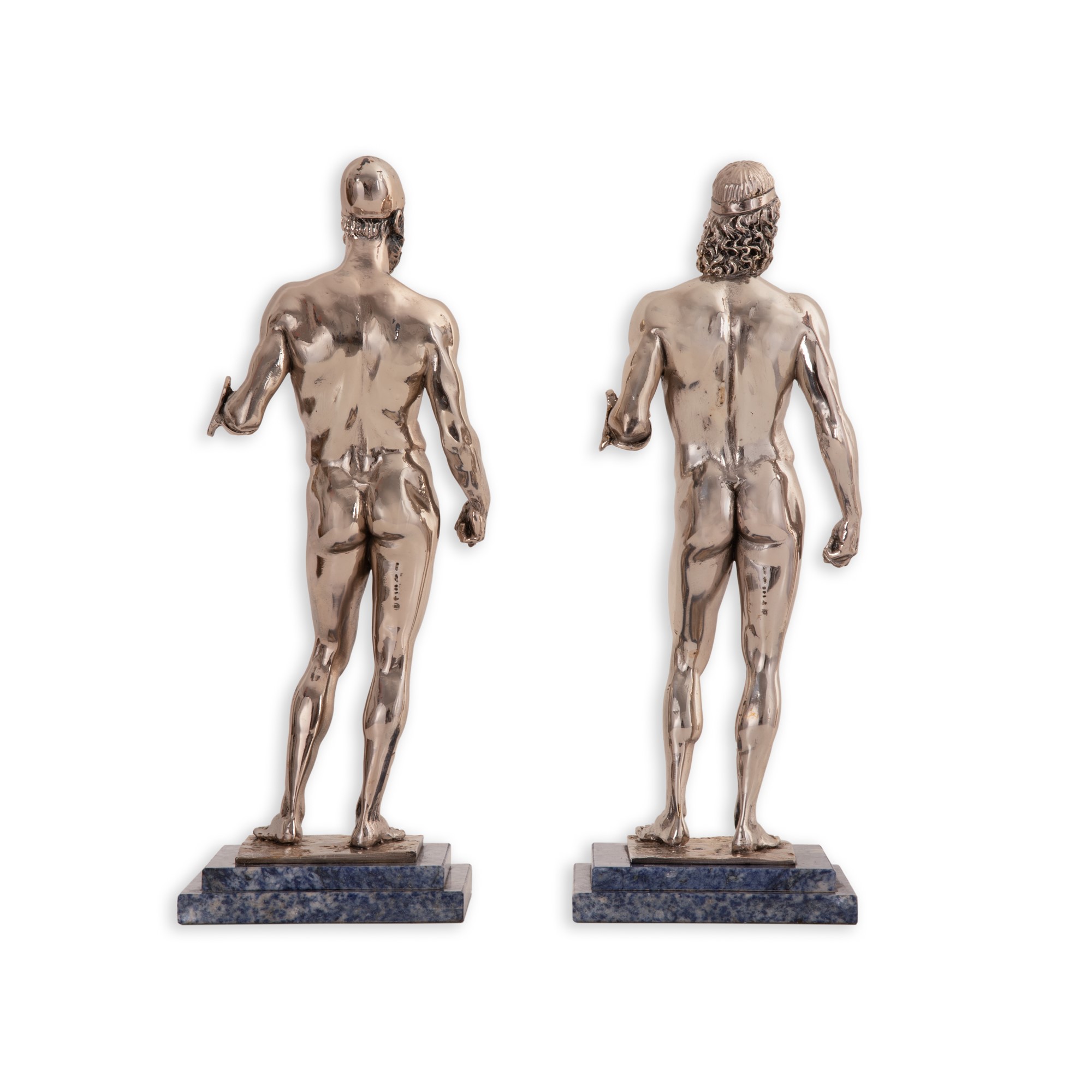 Amilcare Santini Coppia di sculture laminate in argento raffiguranti bronzi di Riace su basi di marmo
