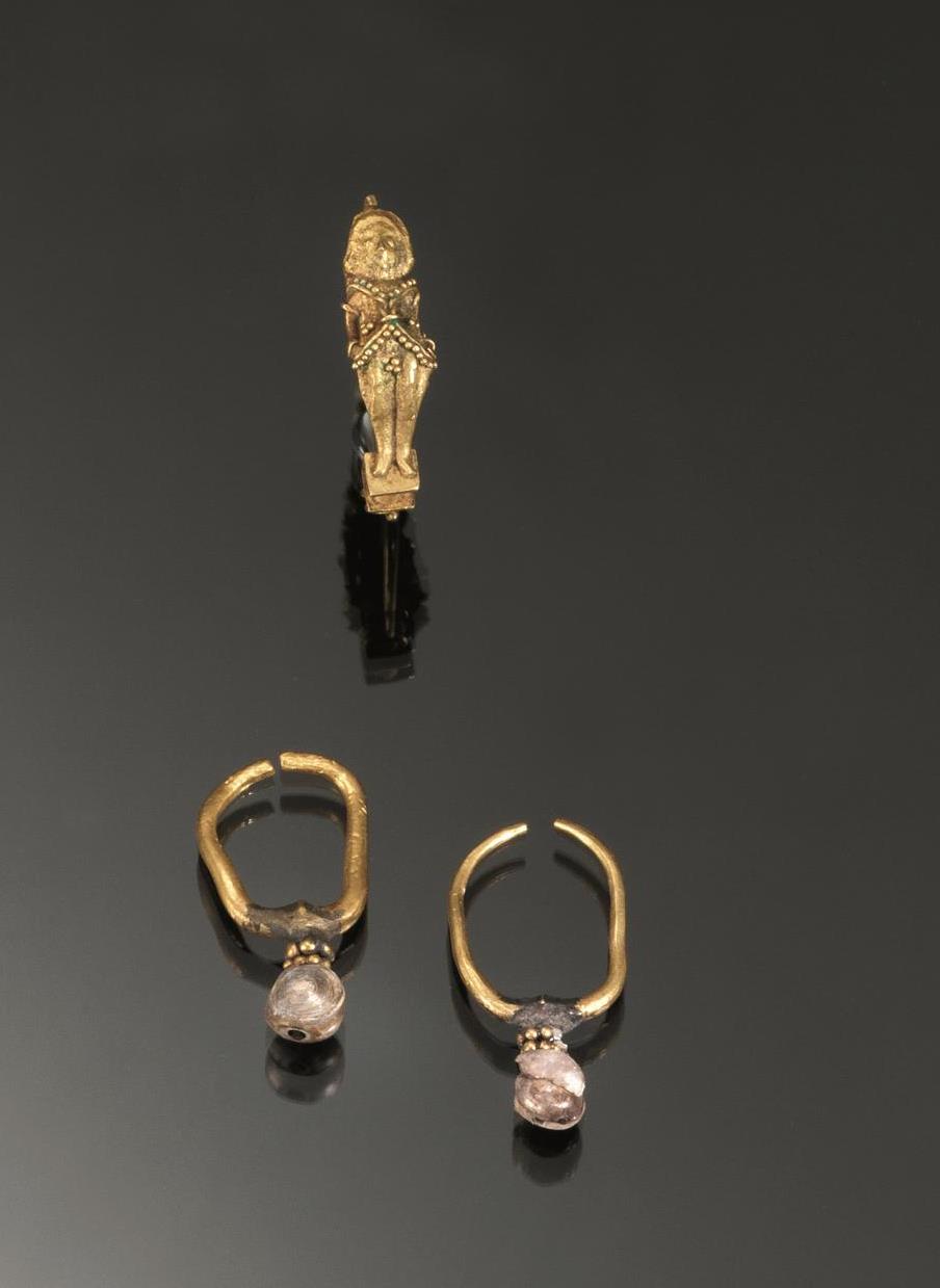 Due orecchini in filo d’argento con pendente a perla di fiume ed un anello in filo d’oro con castone configurato a figura femminile stante con mani sui fianchi (3)