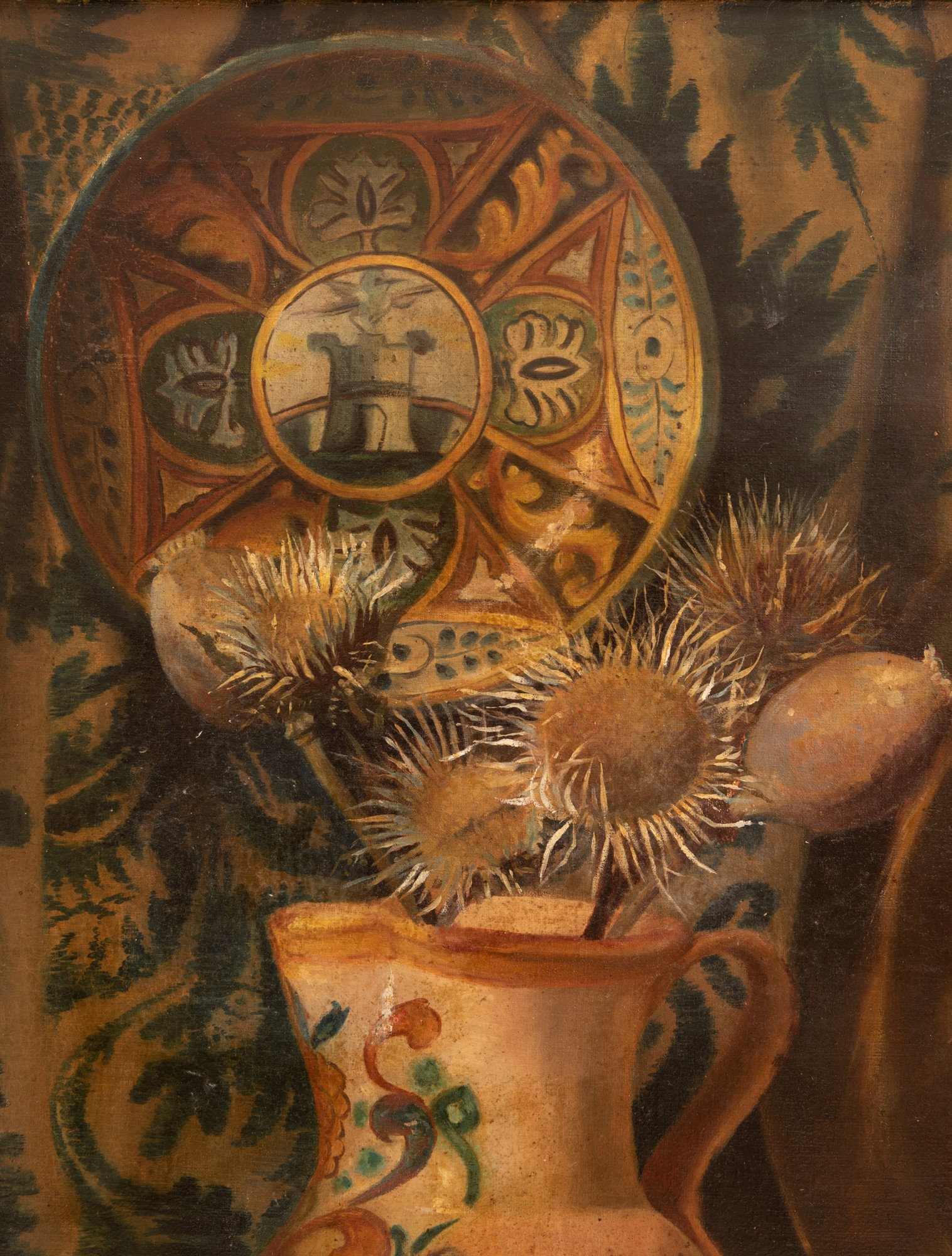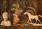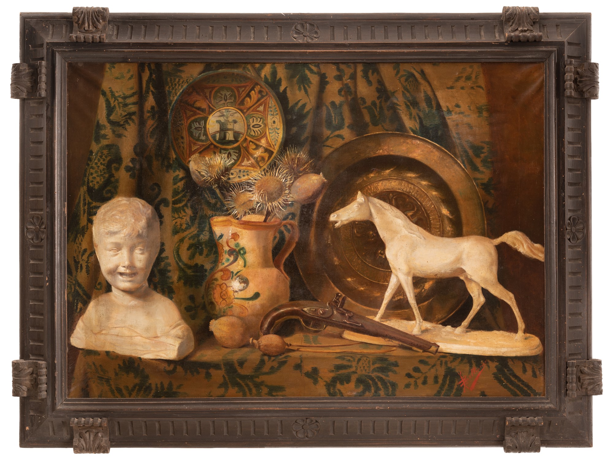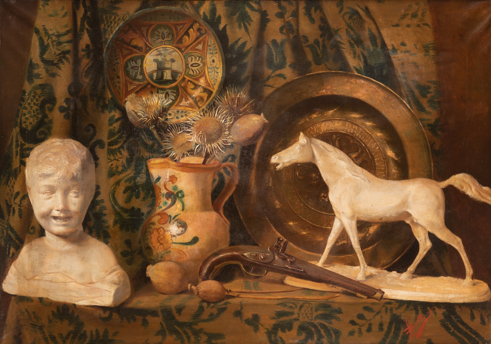 Luigi Bellincioni (attribuito a) Natura morta con maioliche, presentatoio in bronzo e modelli di scultura: cavallo e testa di Desiderio da Settignano.