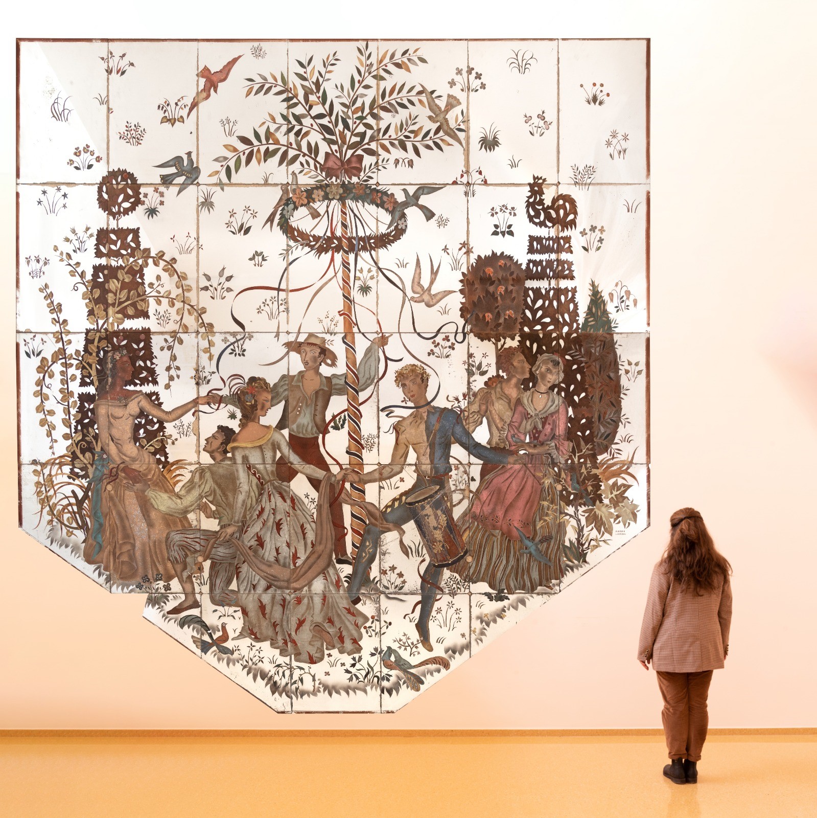 Specchio inciso e decorato composto da 33 pannelli raffiguranti la danza intorno all'albero della libertà.