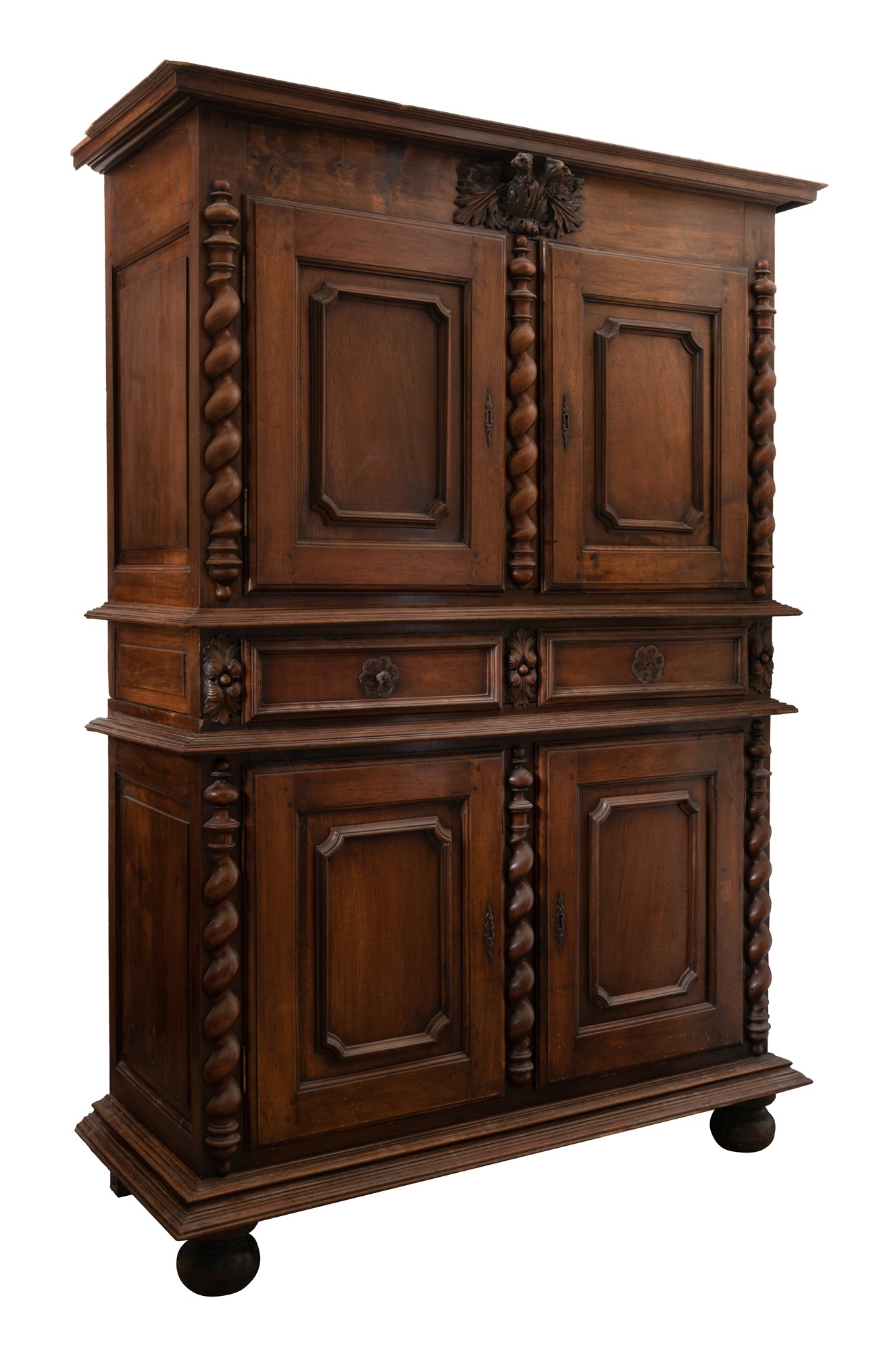 Sul fronte quattro sportelli e due cassetti nella parte centrale incorniciati da colonne a torciglione.