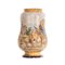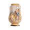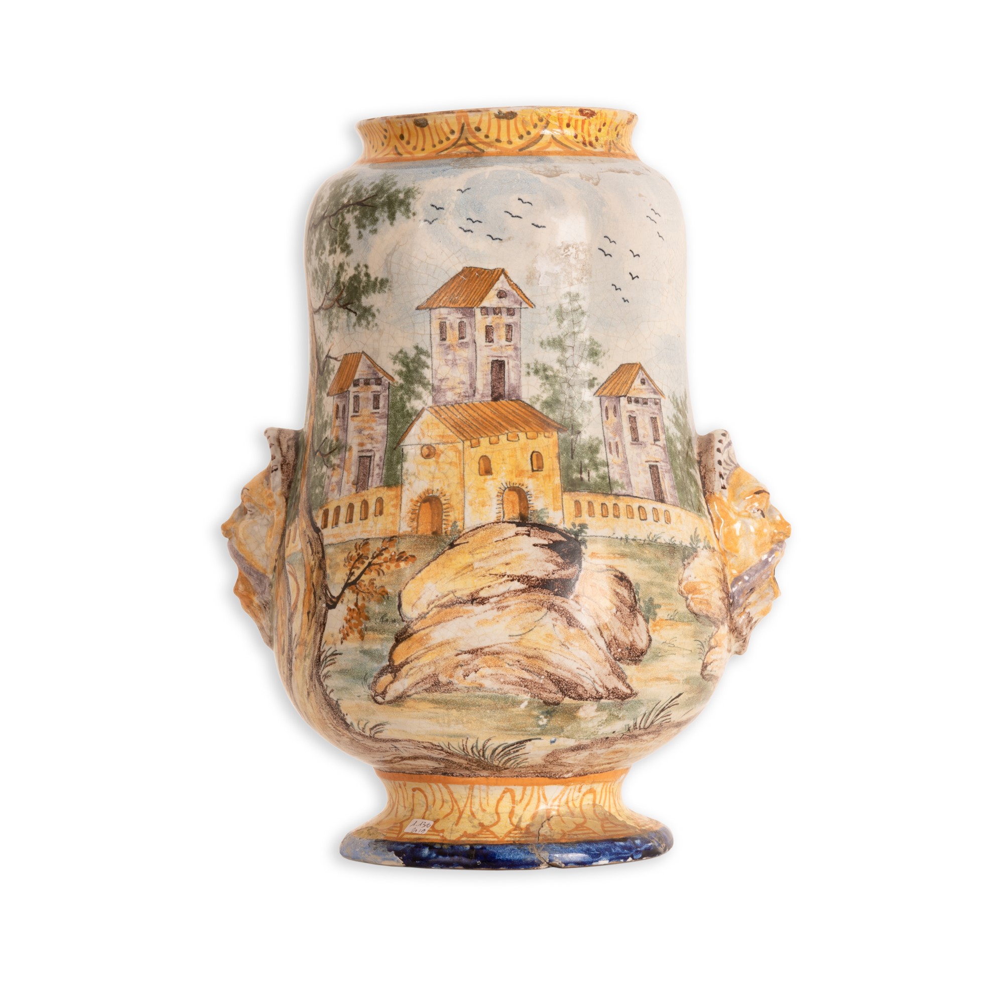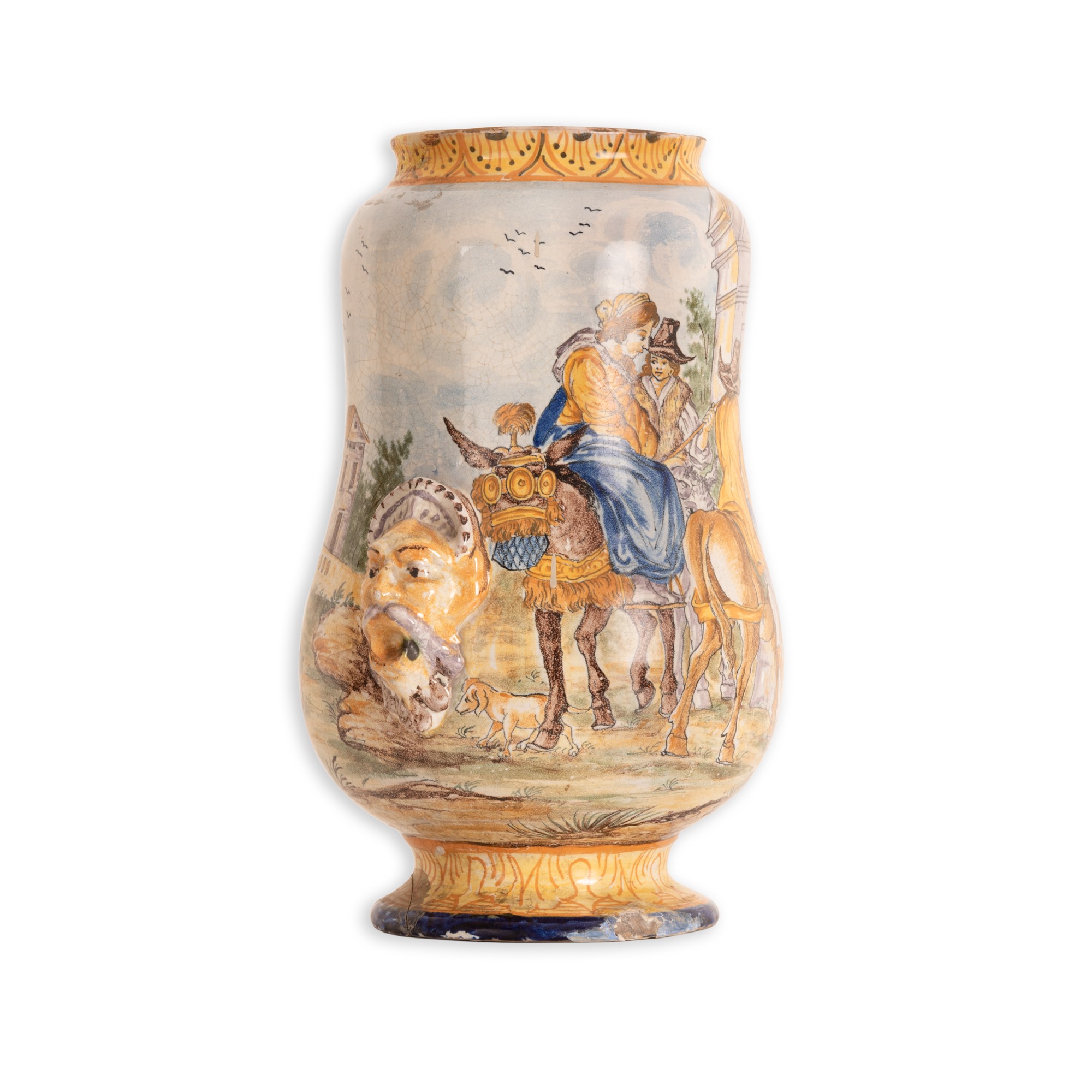 altezza cm 41 Vaso in maiolica istoriato da un lato con contadina su mulo e butteri a cavallo e dall'altro con cinta di mura e case. Ai lati due mascheroni policromi.