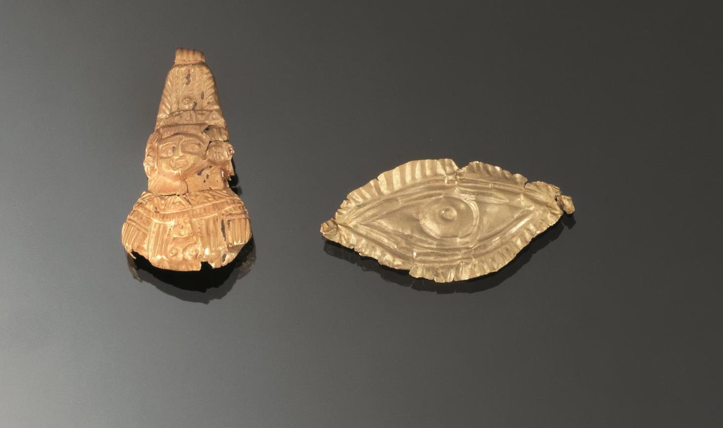 Occhio in lamina d’oro con indicazione delle ciglia, delle palpebre e dell’iride destinato ad una maschera funeraria e pendente in forma di busto di figura femminile con alta acconciatura, orecchini circolari, collana e abito plissettato (2)