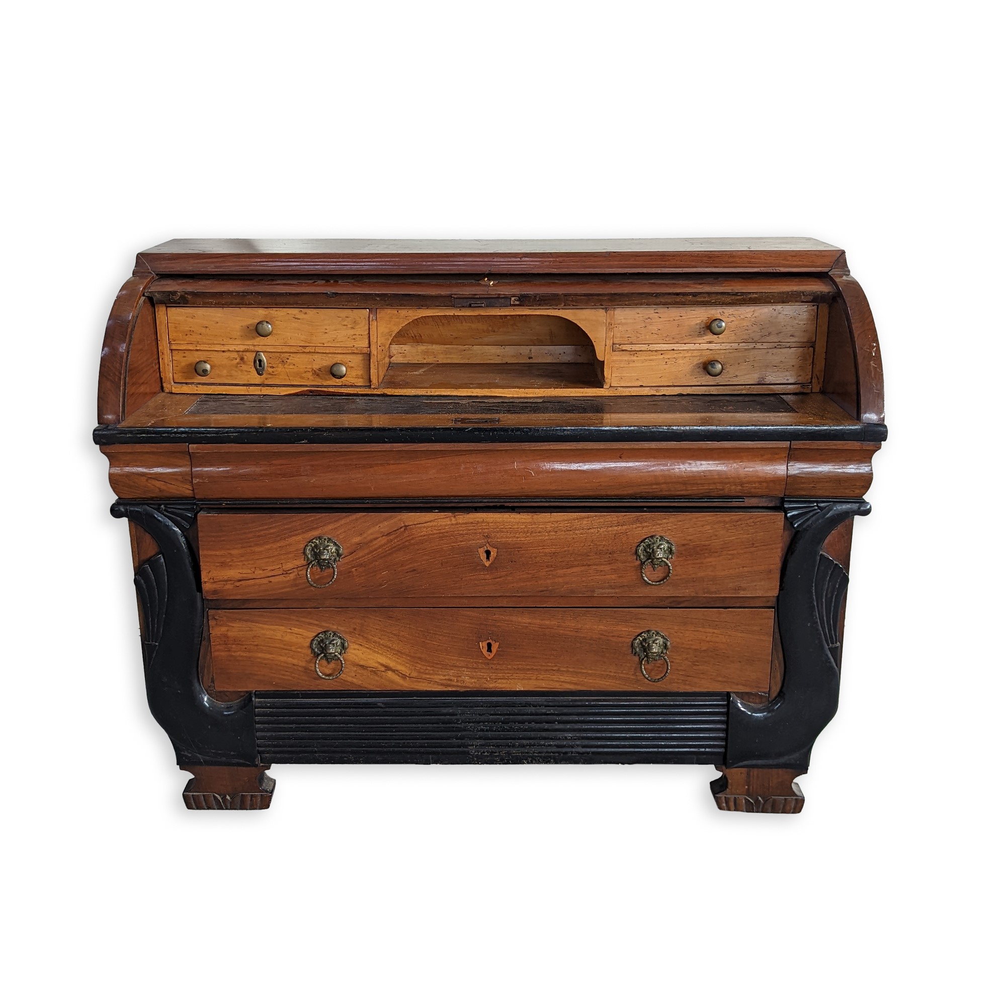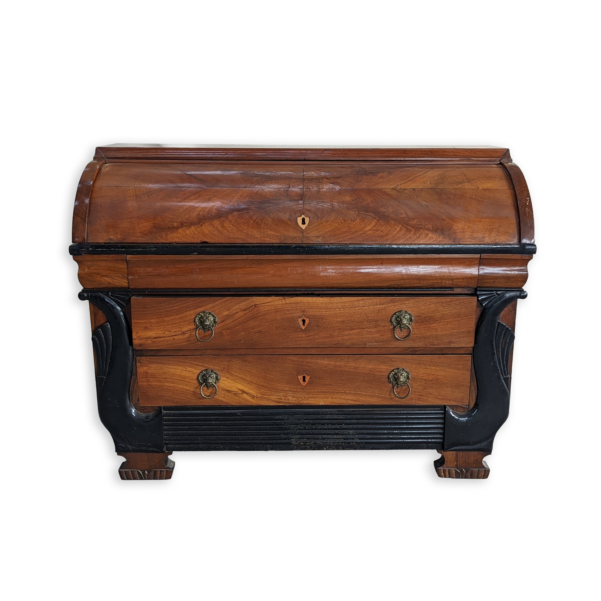 Tre cassetti sul fronte, di cui due con maniglie leonine in bronzo con presa basculante e boccachiave a stemma. Serramenta originale. Cassetto superiore a scomparsa.