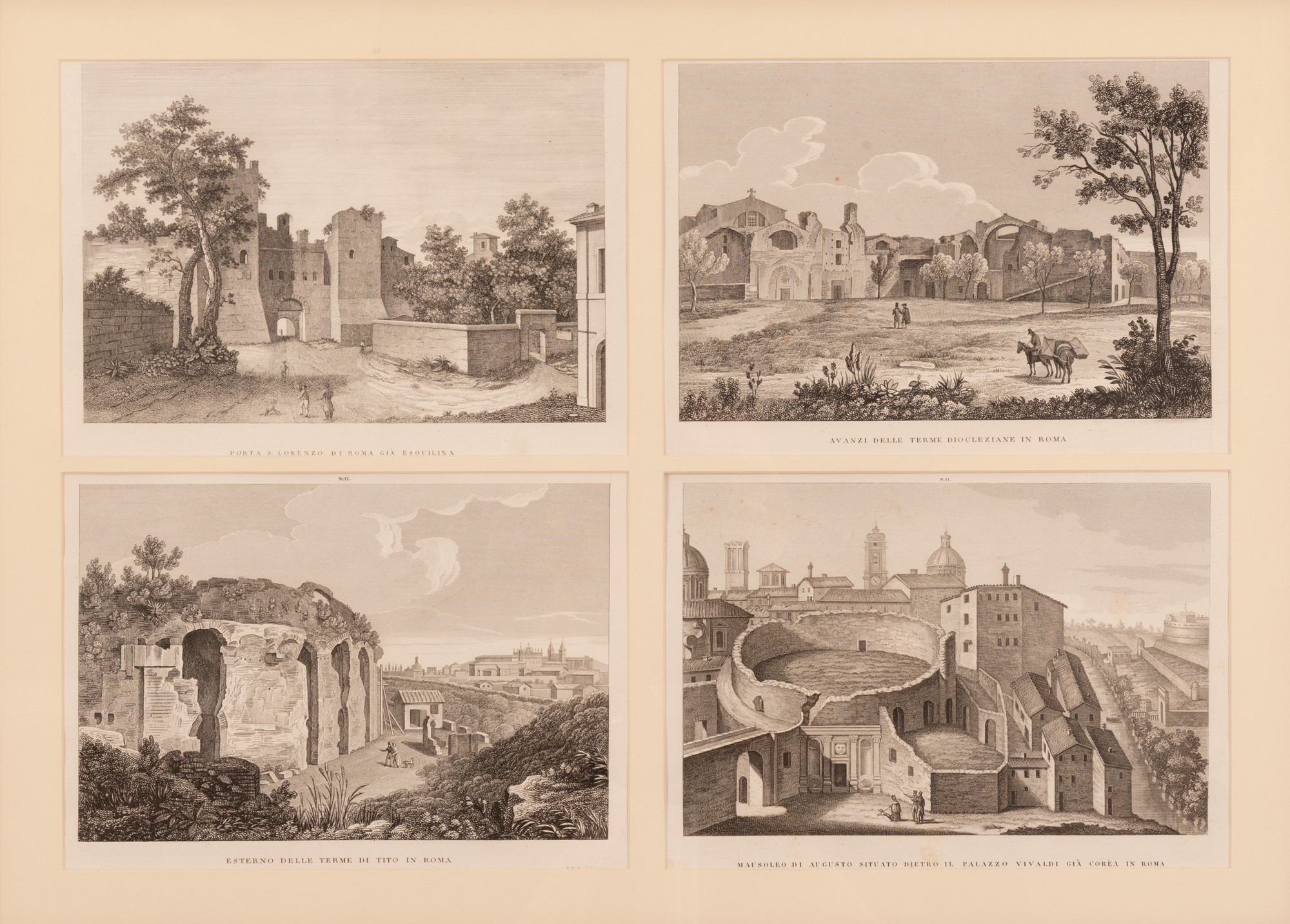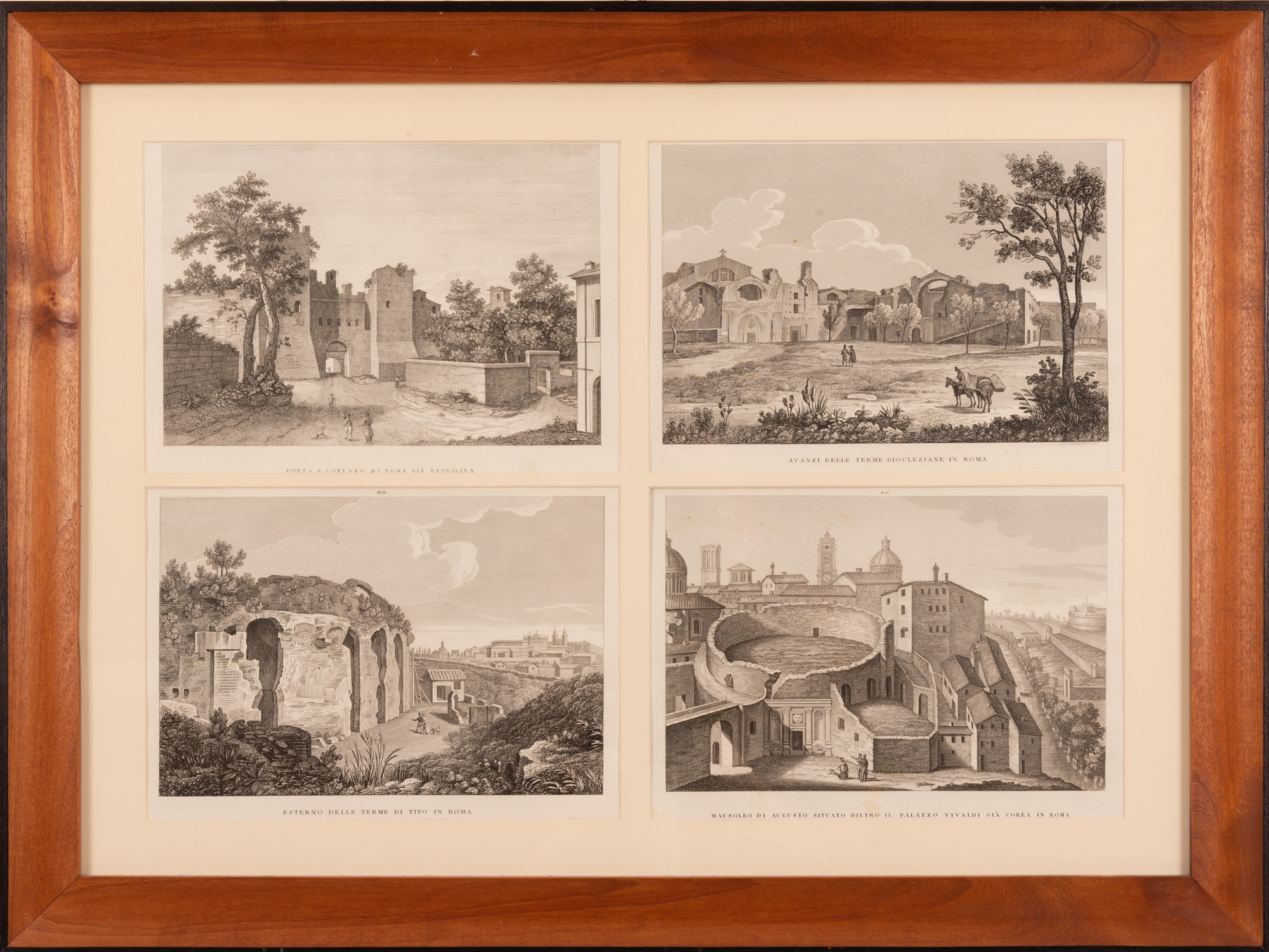 Lotto di quattro incisioni in unica cornice raffiguranti rovine romane