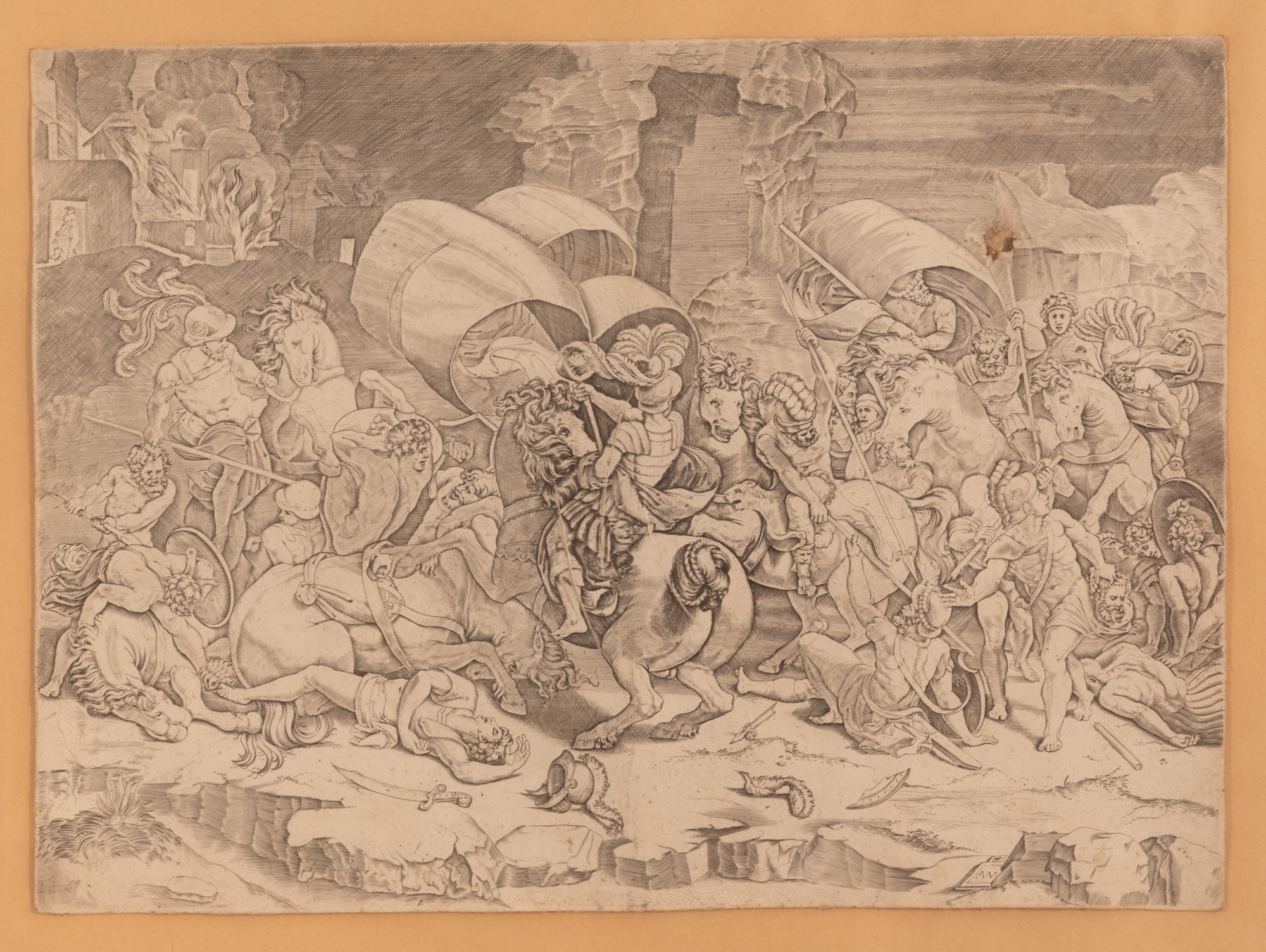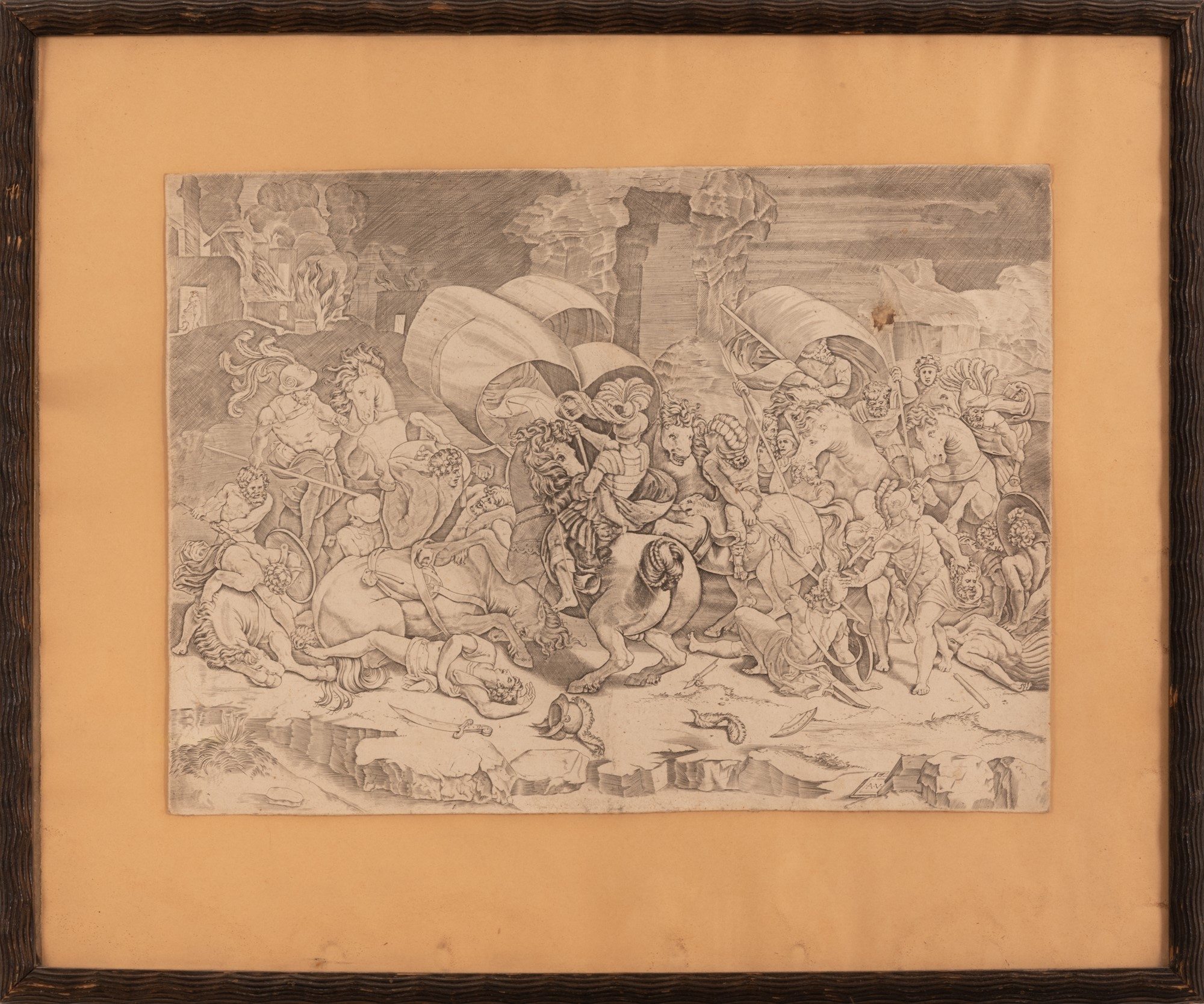 Incisione a bulino cm 35x46; con cornice cm 54x73 L'esemplare, monogrammato AV in un cartiglio in basso a destra è databile intorno alla terza decade del XVI secolo