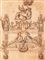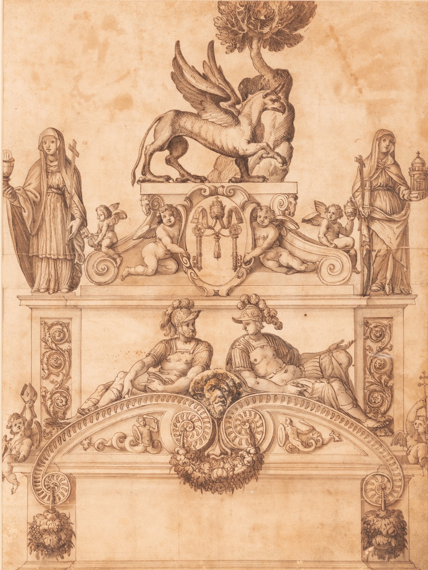 incisione cm 72x53; con cornice 94x75 Il disegno propone un complesso apparato architettonico che sormonta un sarcofago o un apparato effimero. Due figure allegoriche maschili fanno da base alle rappresentazioni della Religione e della Chiesa, contraddistinte dagli emblemi che tengono in mano. Al centro della composizione, l'allusione al papato con le chiavi di San Pietro. Il gruppo è sormontato da un grifone che si appoggia ad una quercia, simbolo della casata.
