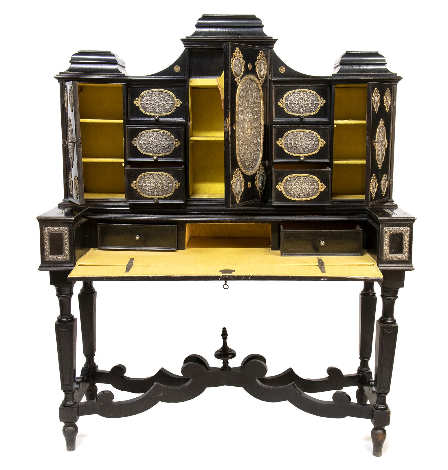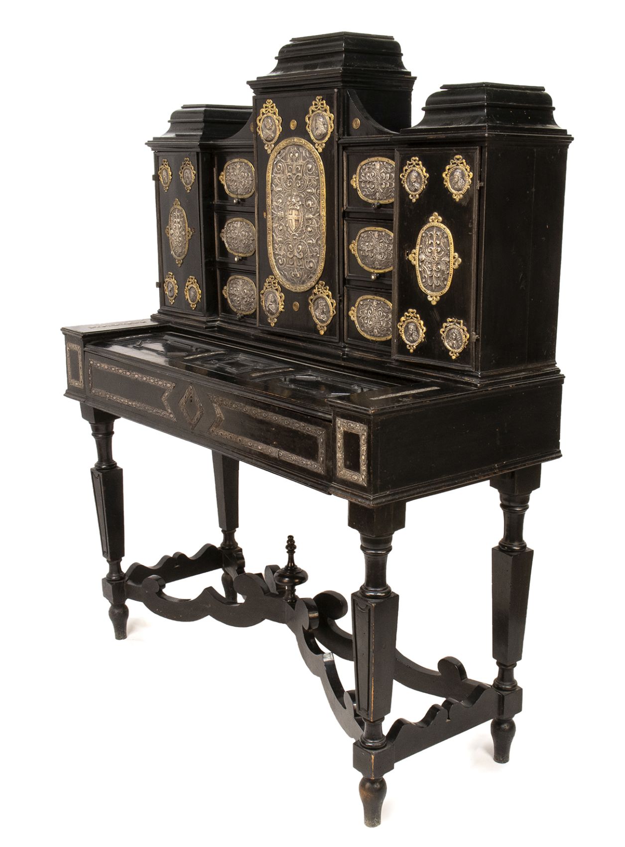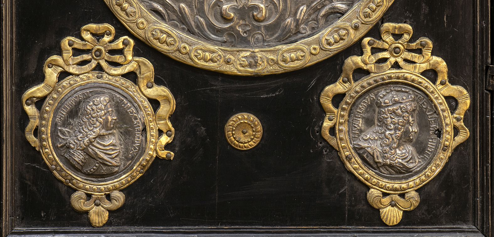 laccato nero, con applicazioni in metallo sugli sportelli laterali raffiguranti familiari di casata nobile; sullo sportello in primo piano campeggia un blasone circondato da volti di regnanti. Le iscrizioni sui ritratti sono difficilmente distinguibili.