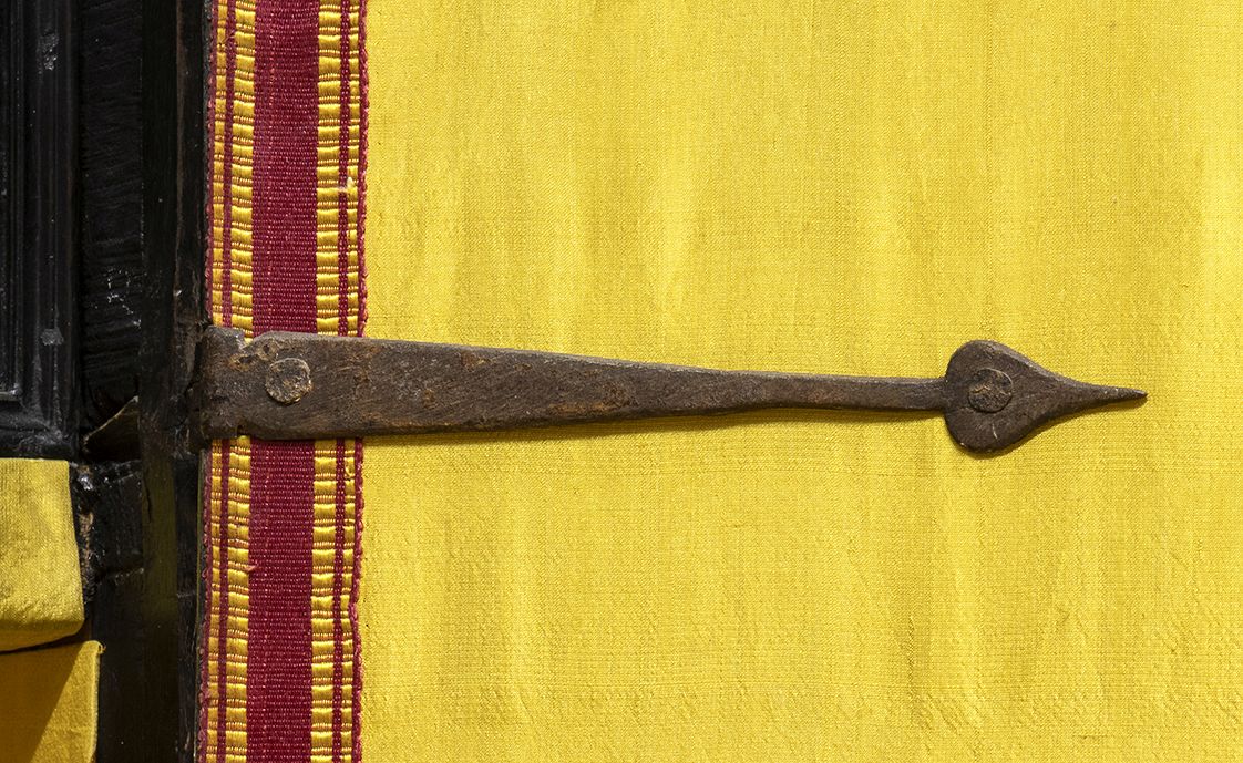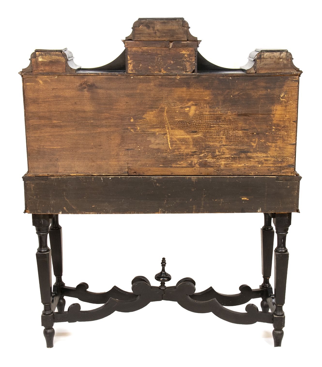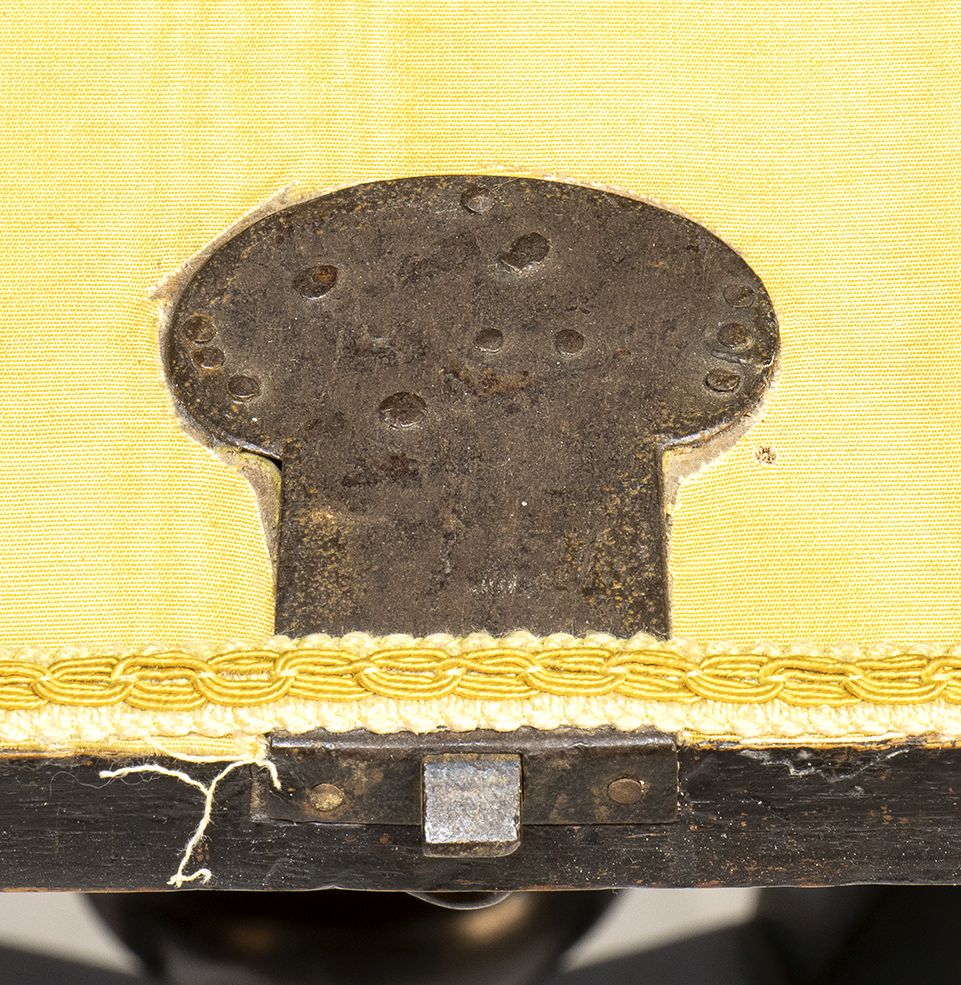 laccato nero, con applicazioni in metallo sugli sportelli laterali raffiguranti familiari di casata nobile; sullo sportello in primo piano campeggia un blasone circondato da volti di regnanti. Le iscrizioni sui ritratti sono difficilmente distinguibili.