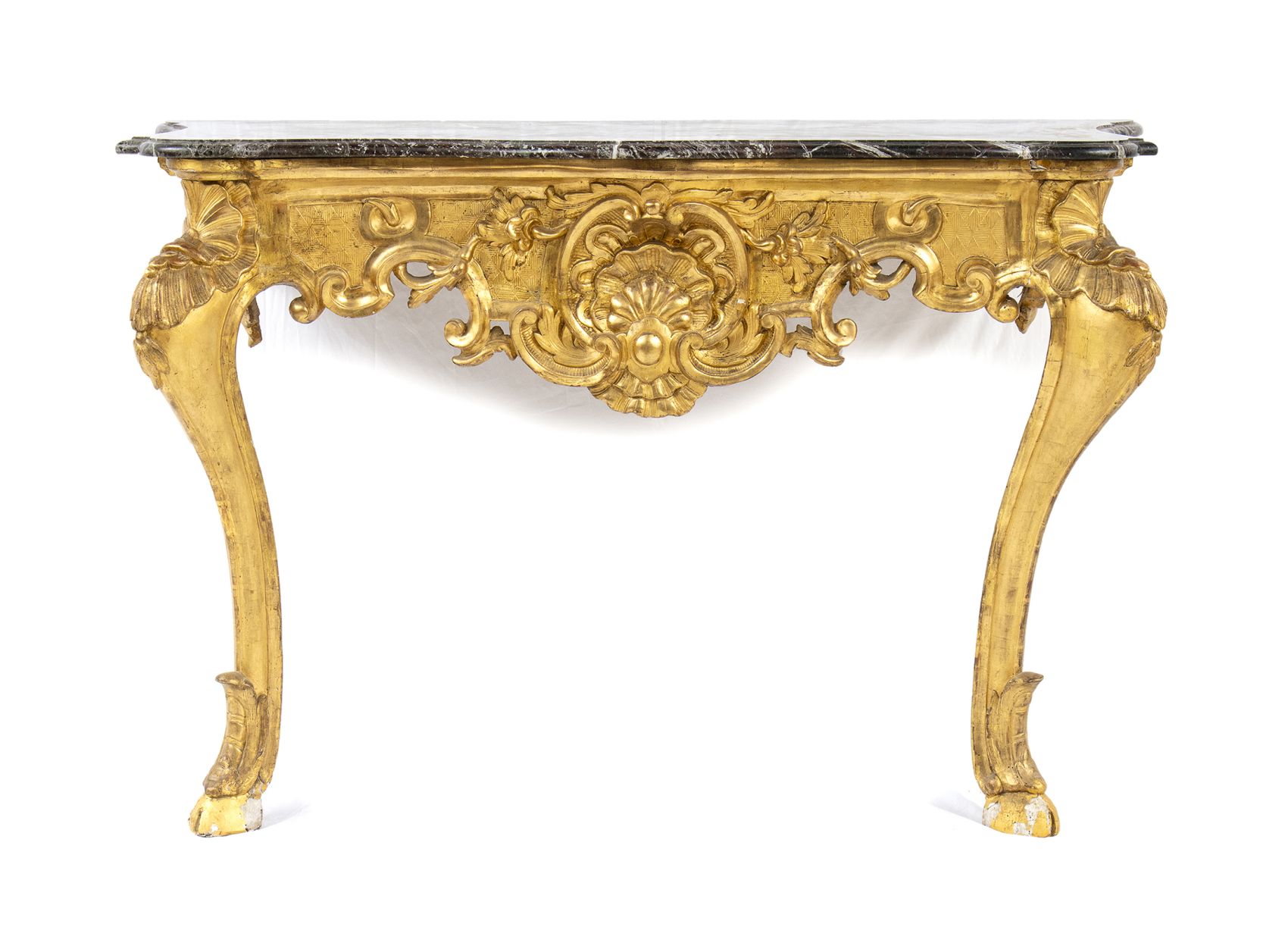 in legno dorato con gambe a cabriolet e piano in marmo.