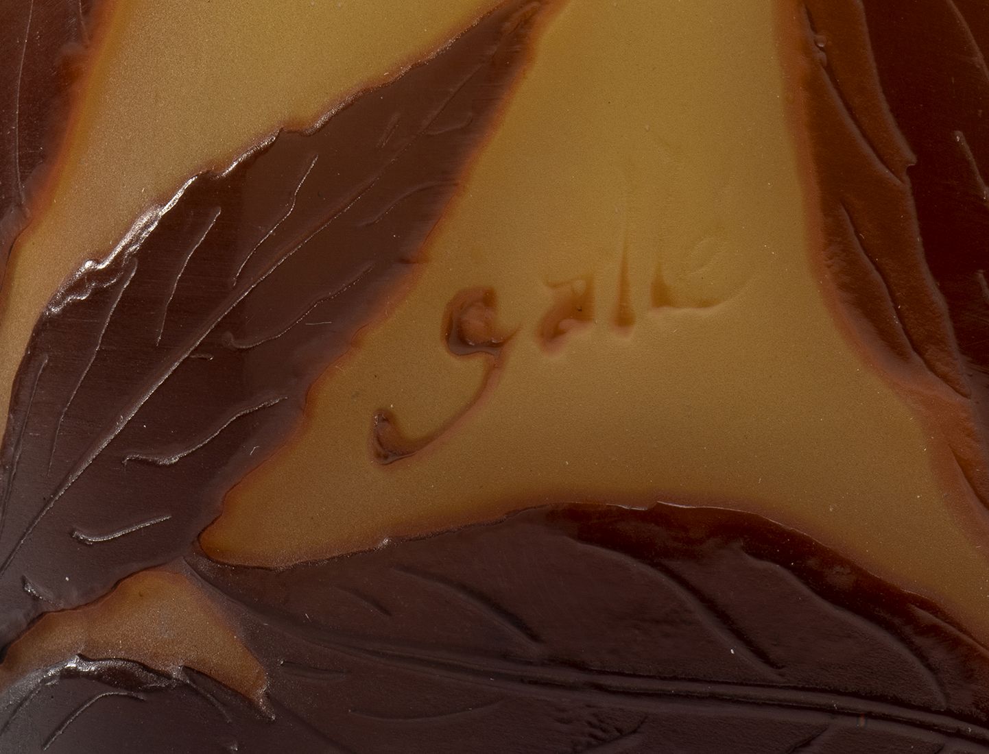 in vetro a cammeo inciso all'acido nei toni del verde e marrone, decorato con motivo floreale e fogliato. Firmato a cammeo in basso. Montatura in metallo dorato.
