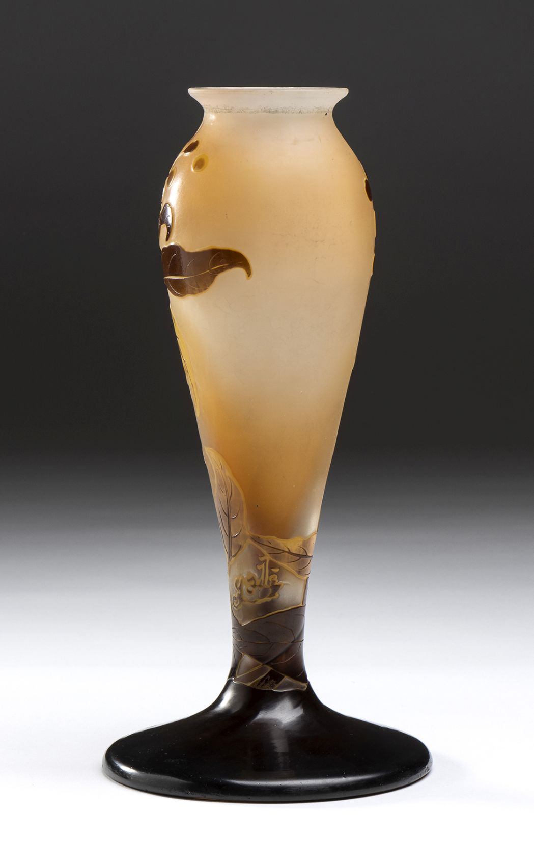 in vetro a cammeo inciso all'acido nei toni del marrone, giallo e cipria, decorato con motivo floreale. Firmato a cammeo in basso.