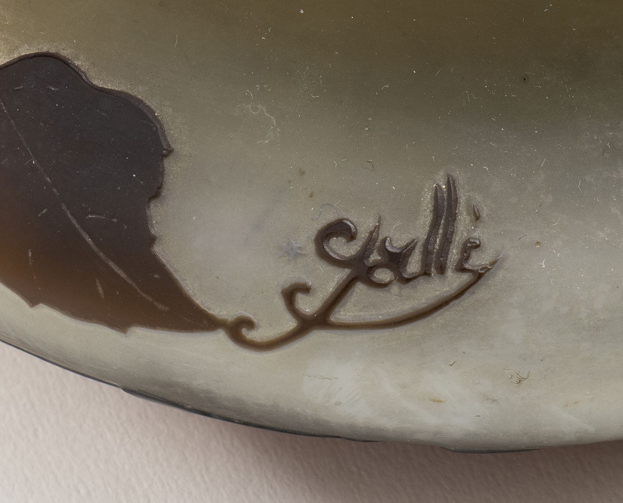 in vetro a cammeo inciso all'acido nei toni del verde e marrone, decorato con motivo fogliato. Firmato a cammeo in basso.