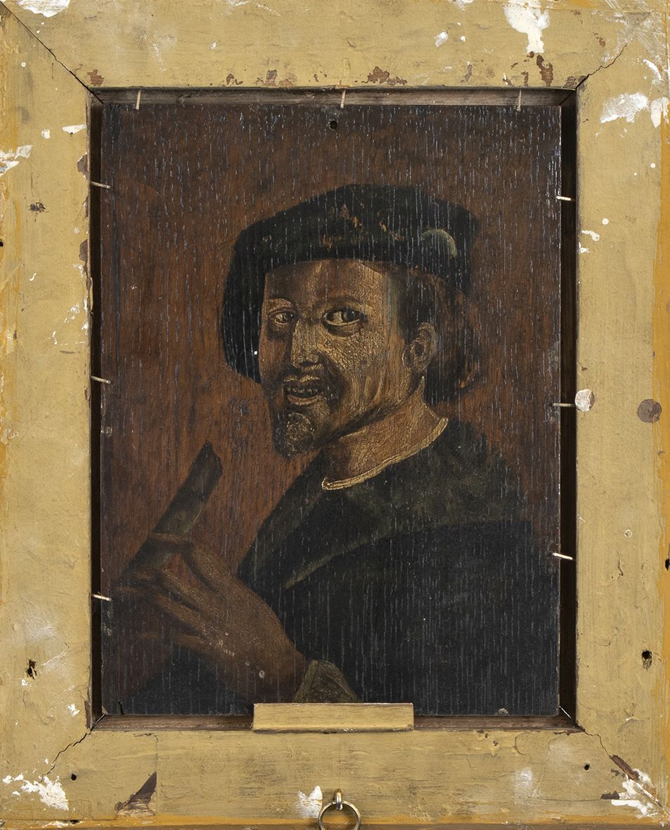 olio su tavola, dipinto su entrambe i lati; sul fronte personaggi con scena di donne al lavoro, sul retro ritratto di artista.