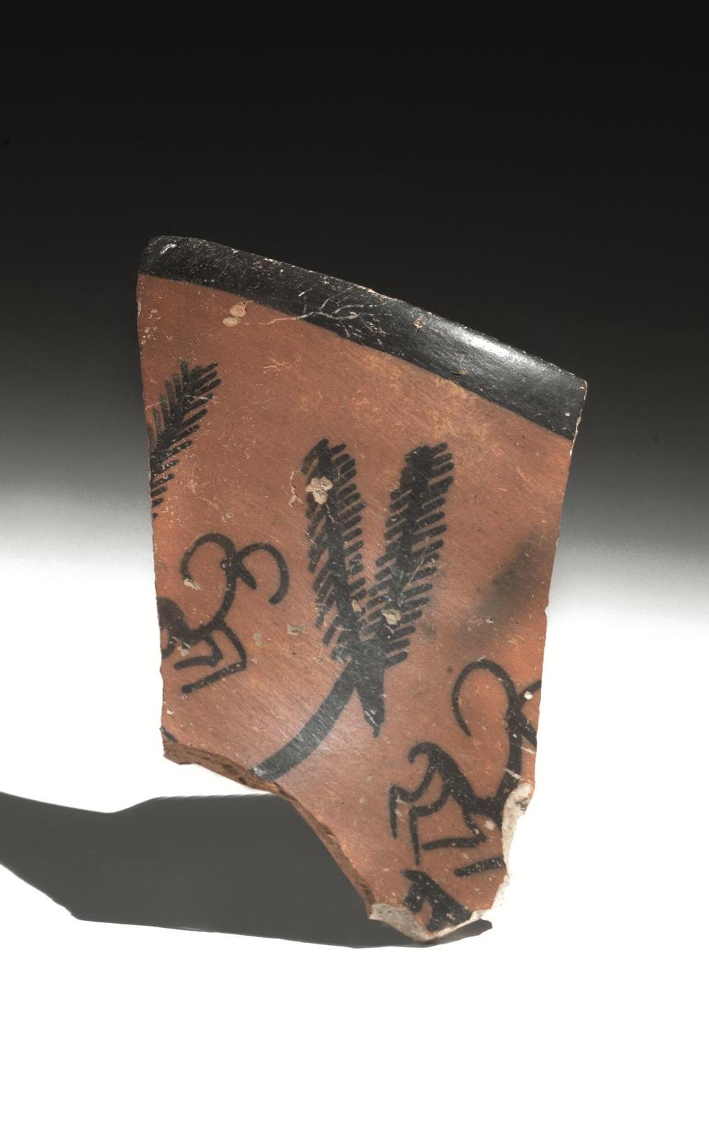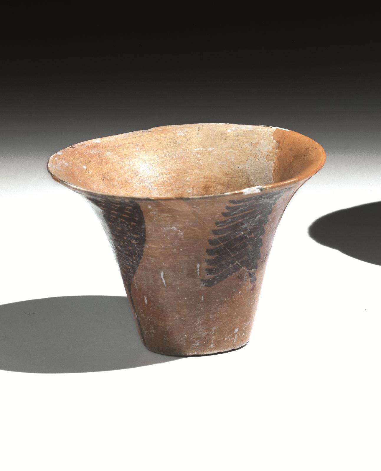 Coppetta di forma troncoconica con ampio labbro estroflesso e fondo piatto, decorata a motivi geometrici e frammento di orlo dipinto con teoria di hibex in corsa a sinistra alternati a cervidi con corna ramificate (2)