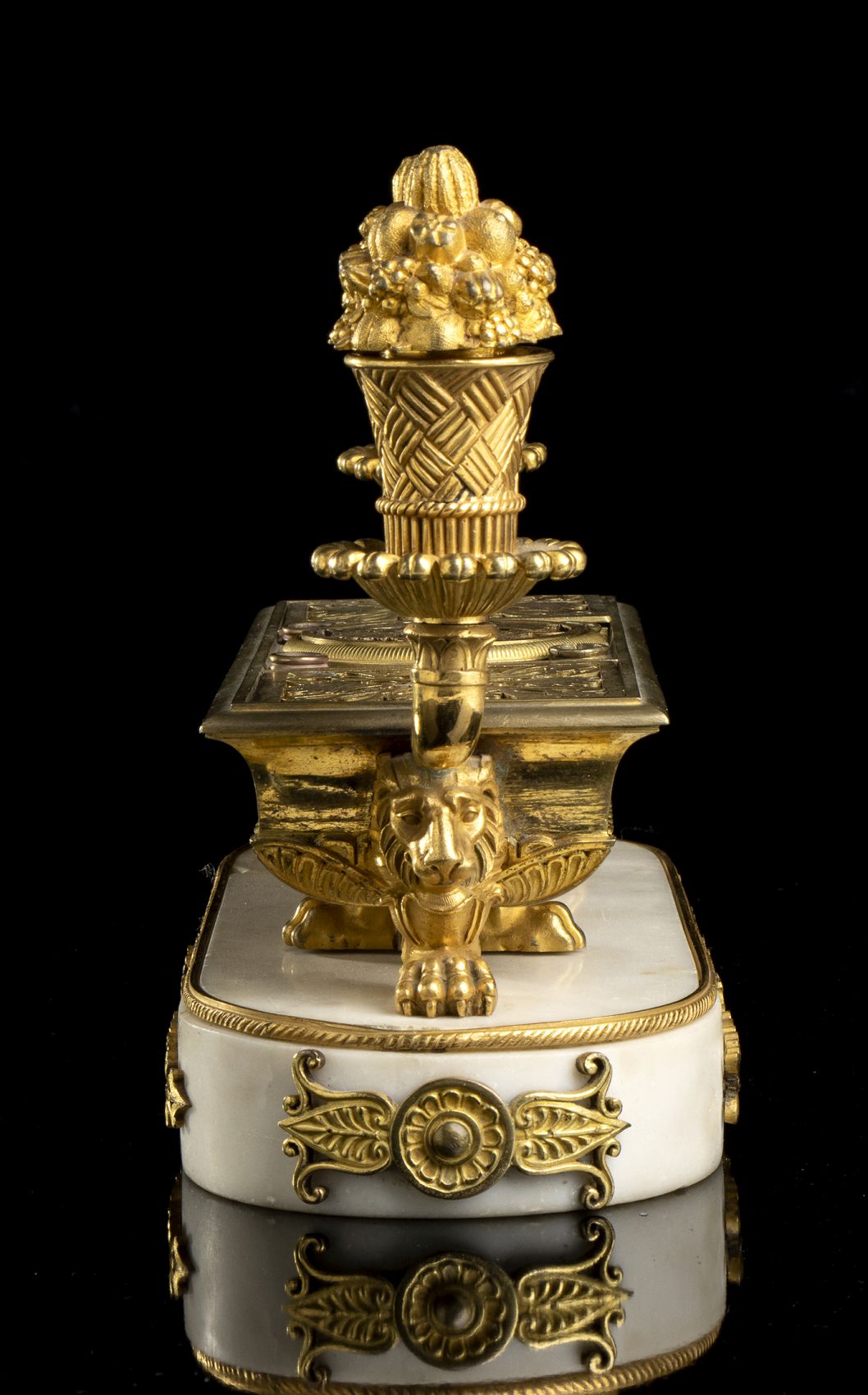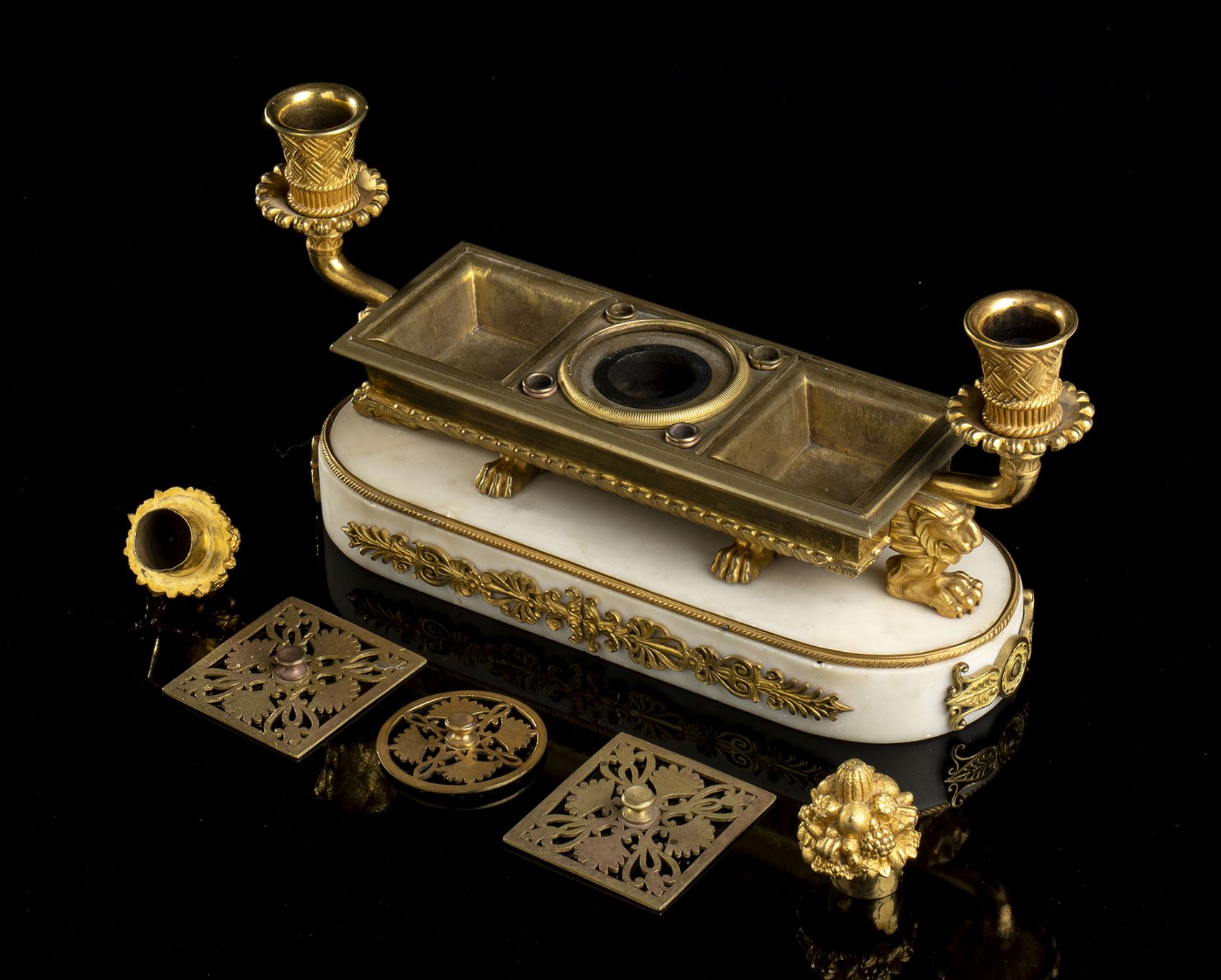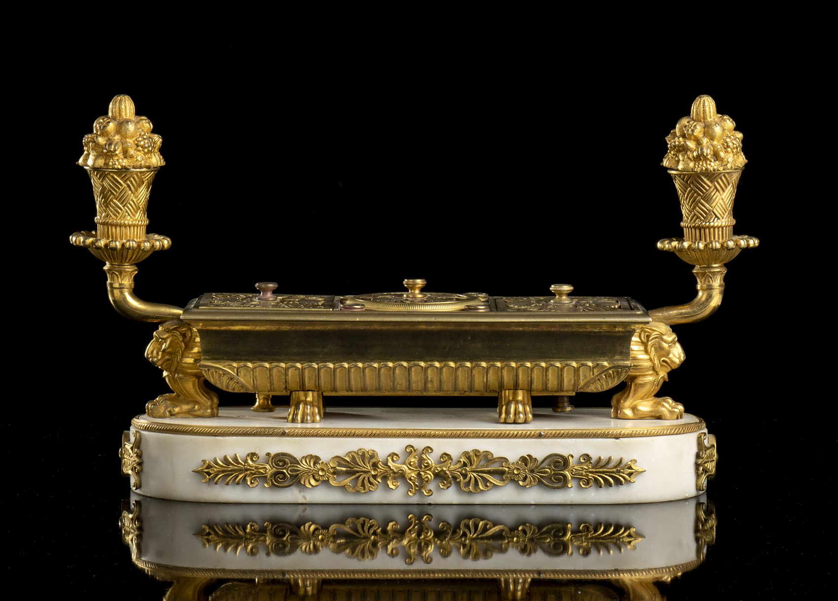 basamento di forma ovale in marmo con applicazioni in bronzo dorato sopra il quale è posto un calamaio in bronzo dorato poggiante su piedi ad artiglio, con porta candela laterali, spargipolvere e porta inchiostro.
