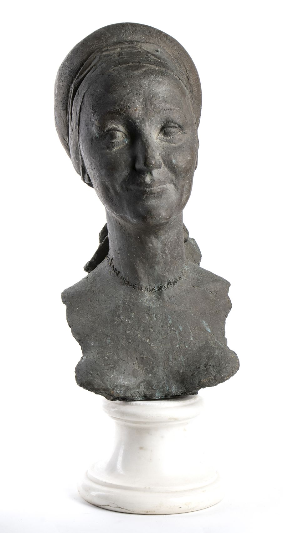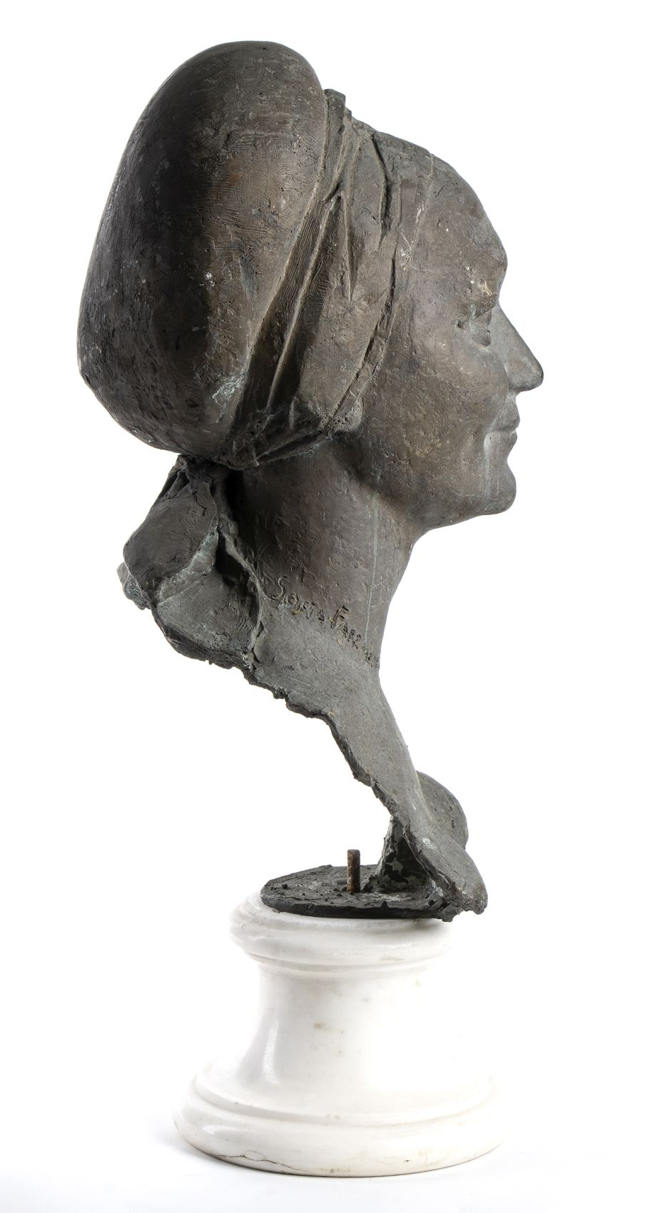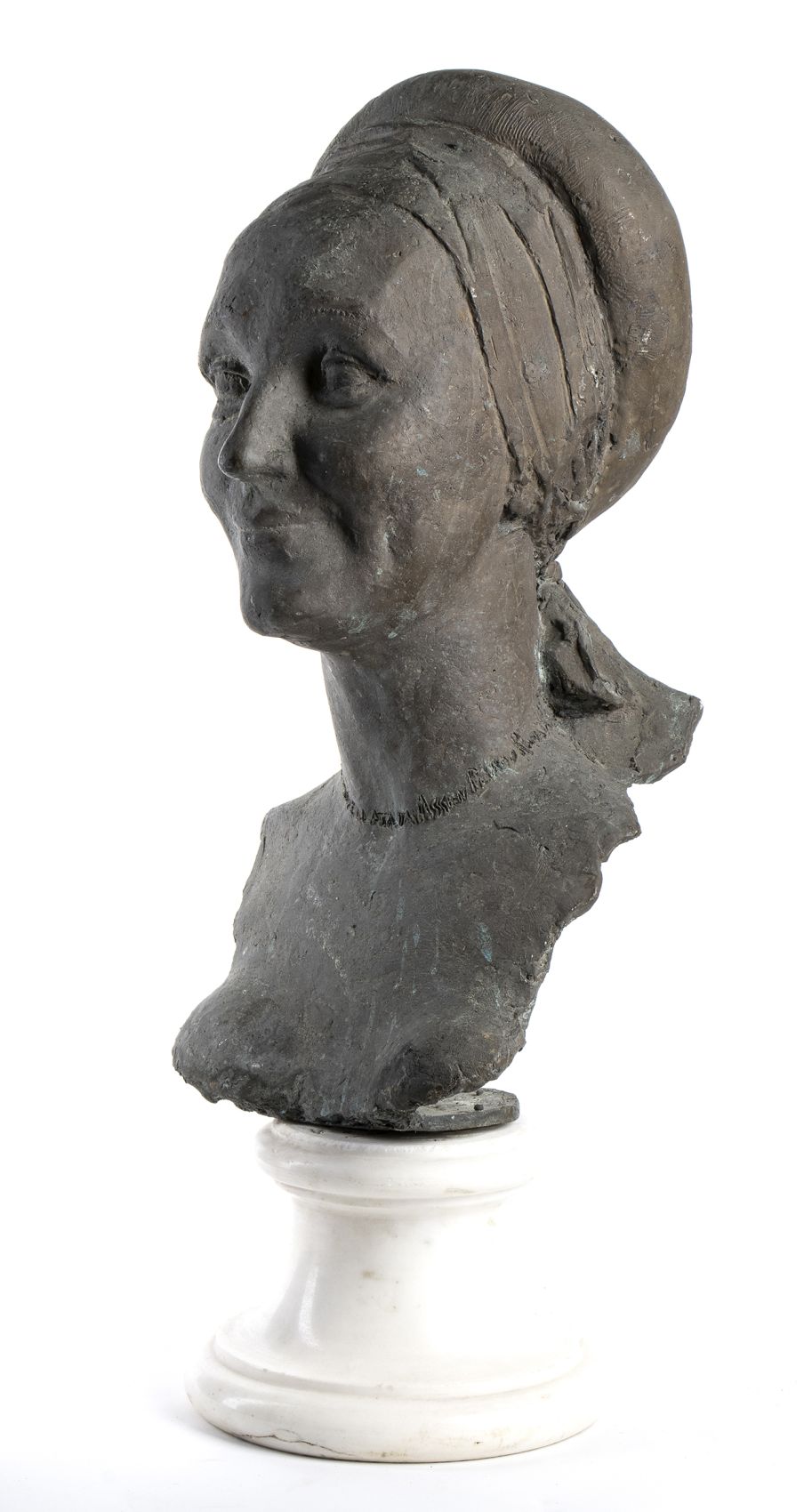 raffigurante donna, posizionata su un sostegno in marmo bianco di Carrara . È presente sul collo del busto la dedica firmata e datata dallo scultore Assen Peikov (1908-1973), autore della statua di Leonardo posta all’ingresso dell’aeroporto di Roma a Fiumicino, rendendo questo pezzo d'arte ancor più unico e significativo. Altezza x larghezza x profondità: 66 x 27 x 27 cm.