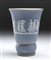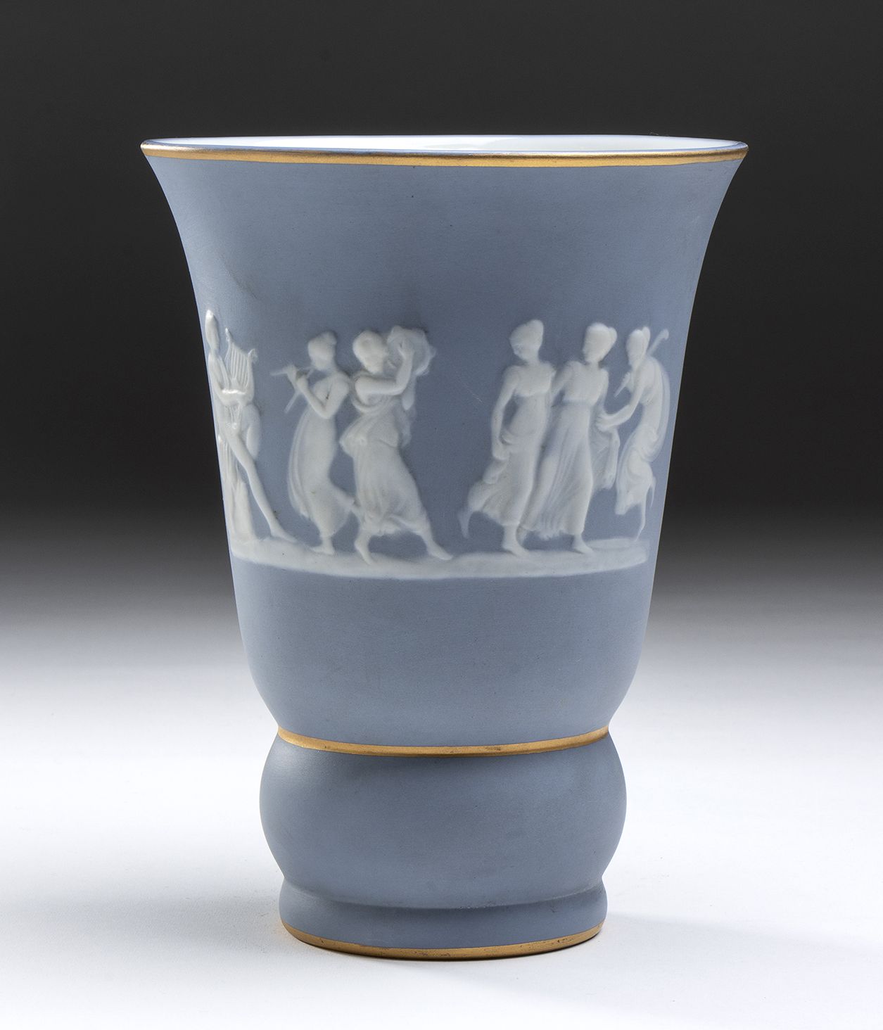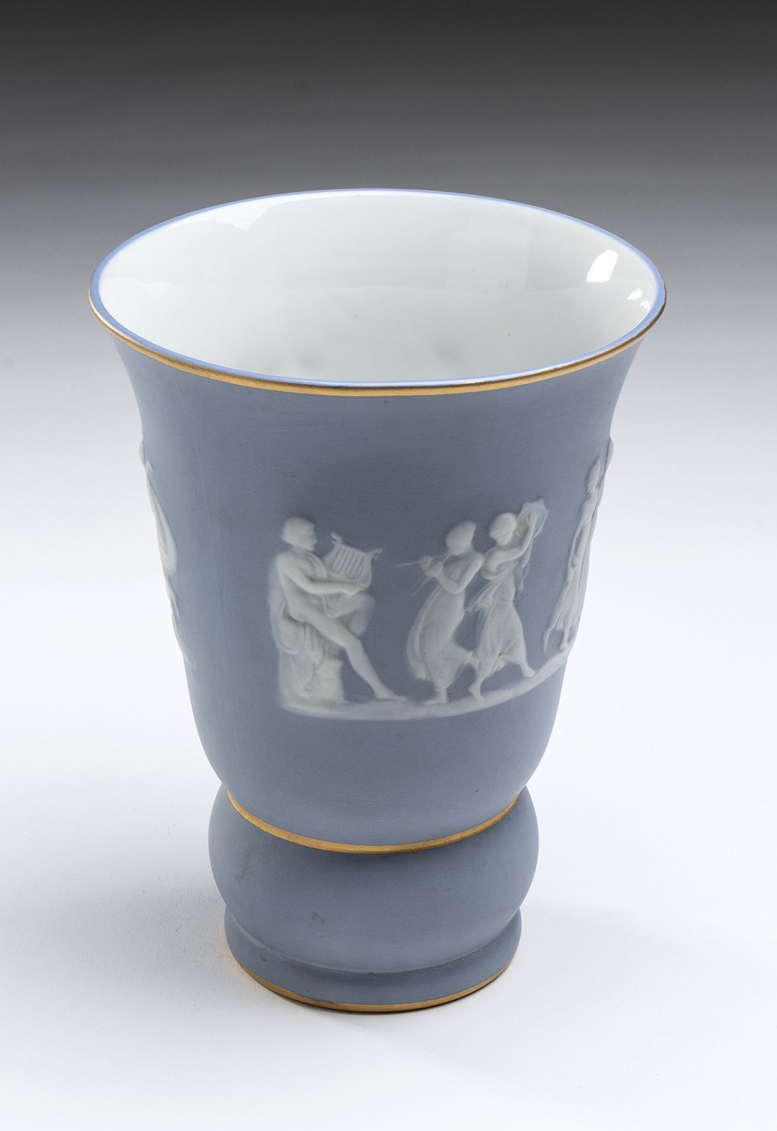 base circolare, corpo svasato nei toni dell'azzurro e del bianco finemente decorato con scene classiche a cammeo. Finiture dorate.