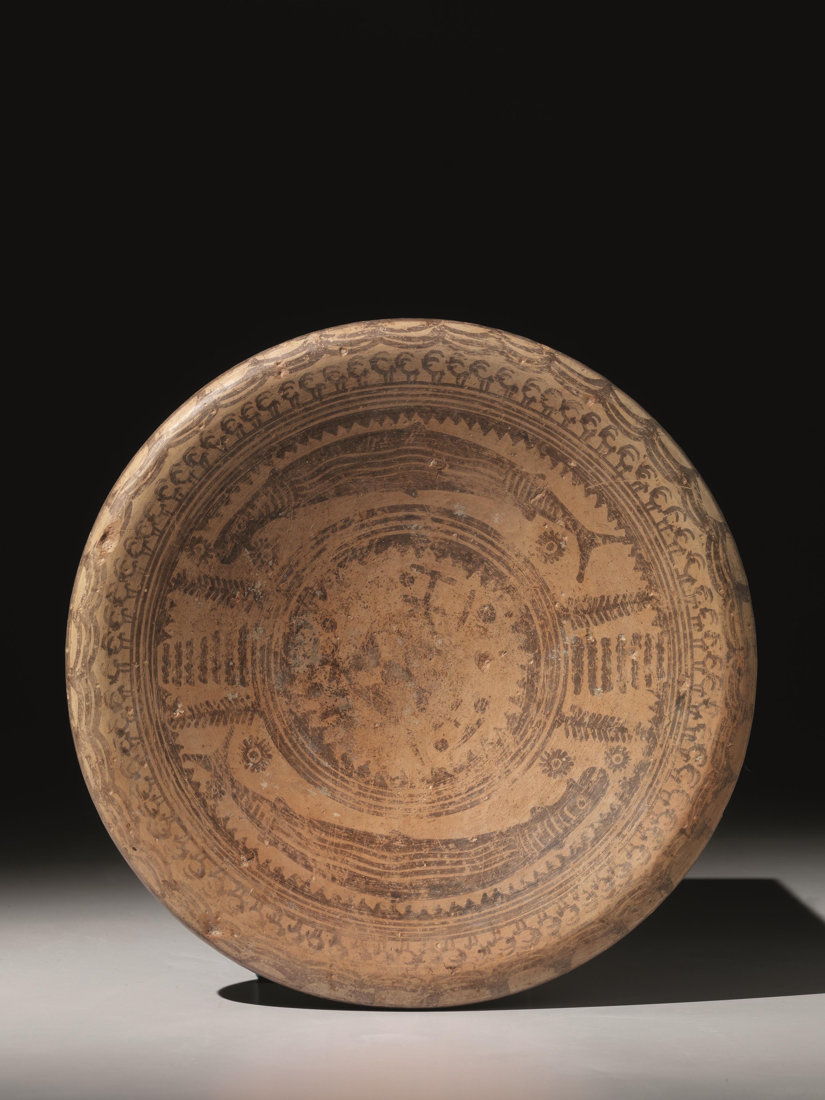 Decorazione: sull’orlo fascia in bruno, sul bordo teoria di capridi dalle lunghe corna ritorte volti a destra fra archetti penduli e linee parallele concentriche cui fa seguito una fascia più ampia con due grandi pesci fra alberelli e motivi floreali, al centro con motivi geometrici