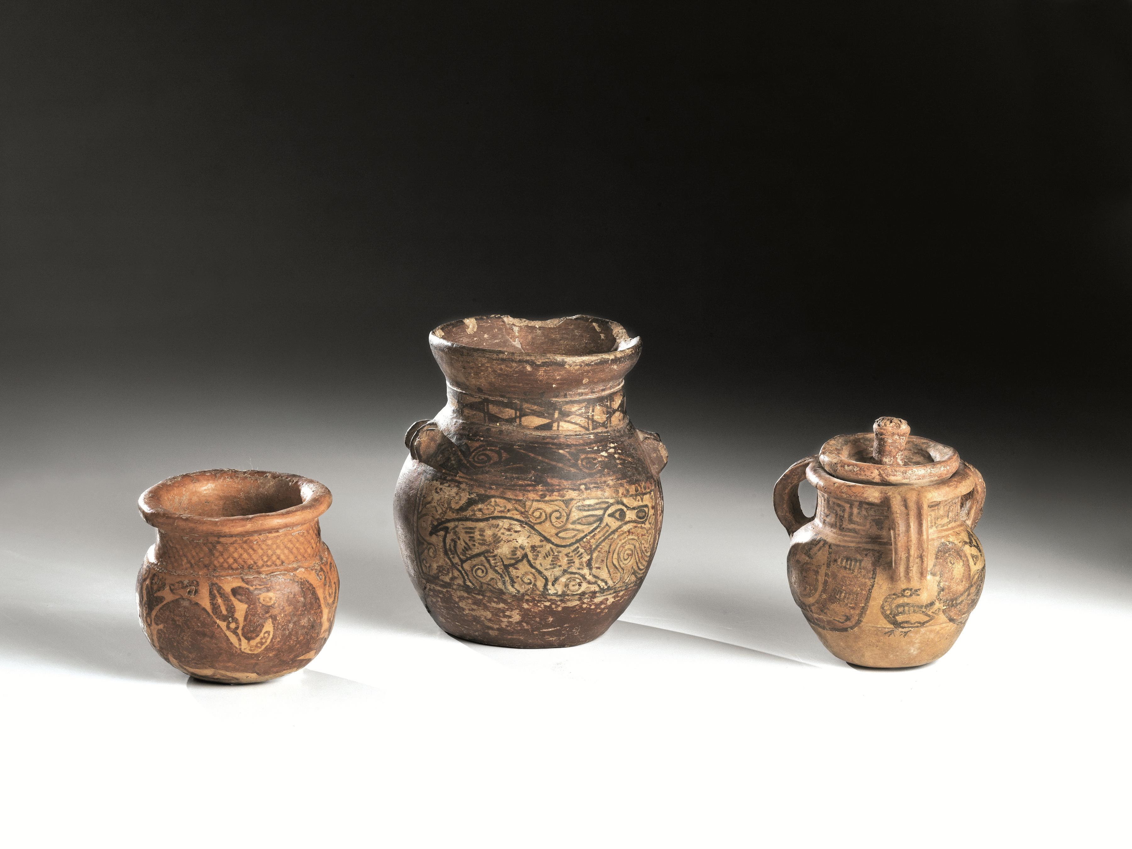 Olla con labbro estroflesso, breve collo rettilineo, corpo ovoide, fondo piatto, due piccole anse a presa sulla spalla, decorata sul collo con motivi geometrici, sulla spalla con tralcio fitomorfo e sul ventre con due grandi metope con un cervide gradiente a sinistra fra vegetazione stilizzata; olletta con coperchio, con orlo estroflesso, collo cilindrico, corpo ovoide, fondo piatto, tre anse a nastro costolate impostate dall’orlo alla spalla decorata sul collo con motivo a meandro e sul ventre con essere fantastici dalla testa antropomorfa e oche retrospicienti sotto le anse; olletta con orlo estroflesso, collo cilindrico, corpo ovoide, fondo piatto, decorata con motivo geometrico sul collo e sul ventre con tre cavalli in corsa a sinistra e retrospicienti fra motivi vegetali (3)